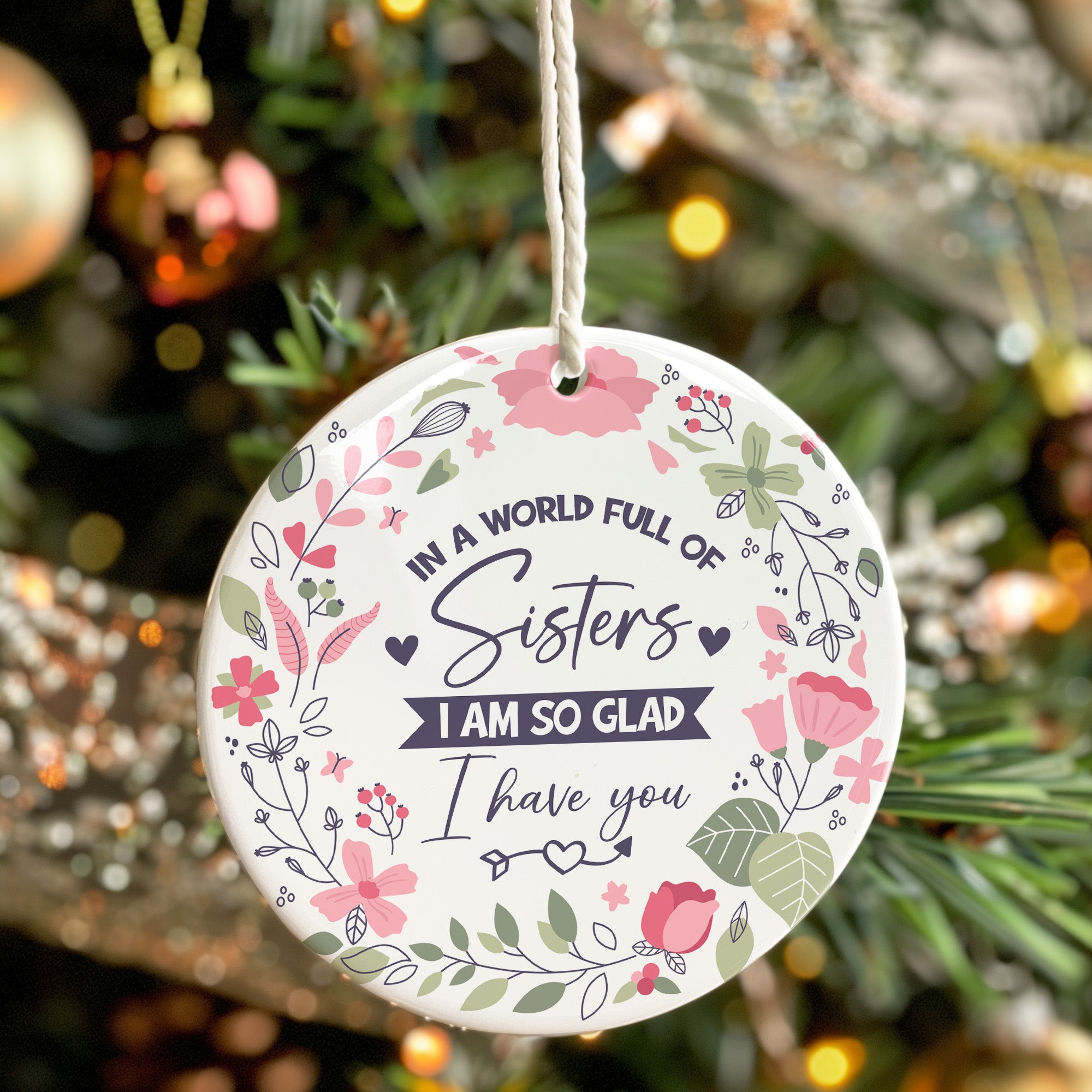 Embrace the joy of sisterhood with our Beautifully Crafted Floral Ceramic Sister Ornament. This charming piece features a delightful design of delicate pink and green floral patterns encircling a heartfelt message: "In a world full of sisters, I am so glad I have you." It's an ideal choice for anyone looking to express appreciation and love in a meaningful way.