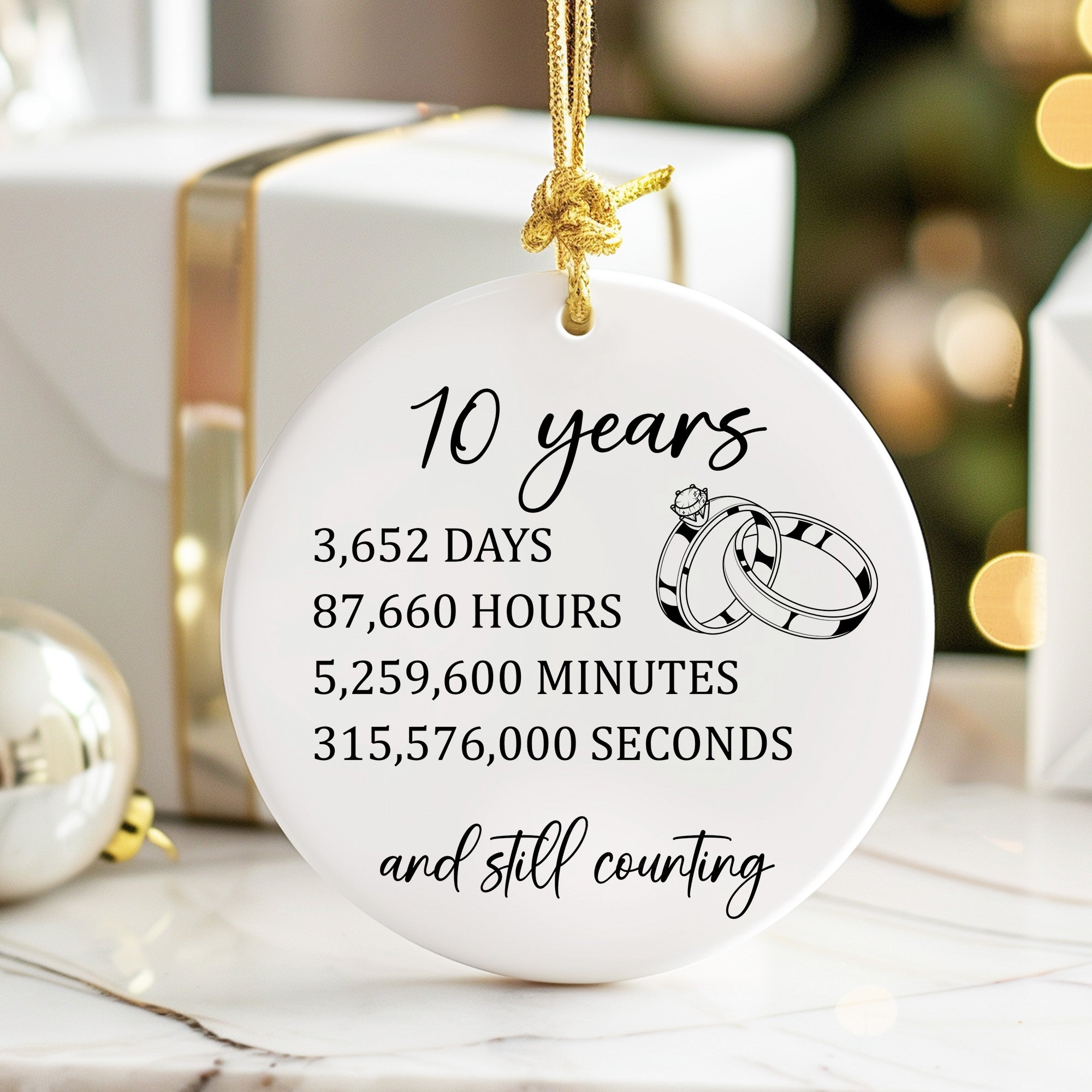 Capturing the essence of time spent together, this ornament elegantly displays the journey of 10 years broken down into days, hours, minutes, and seconds, serving as a reminder of every cherished moment.