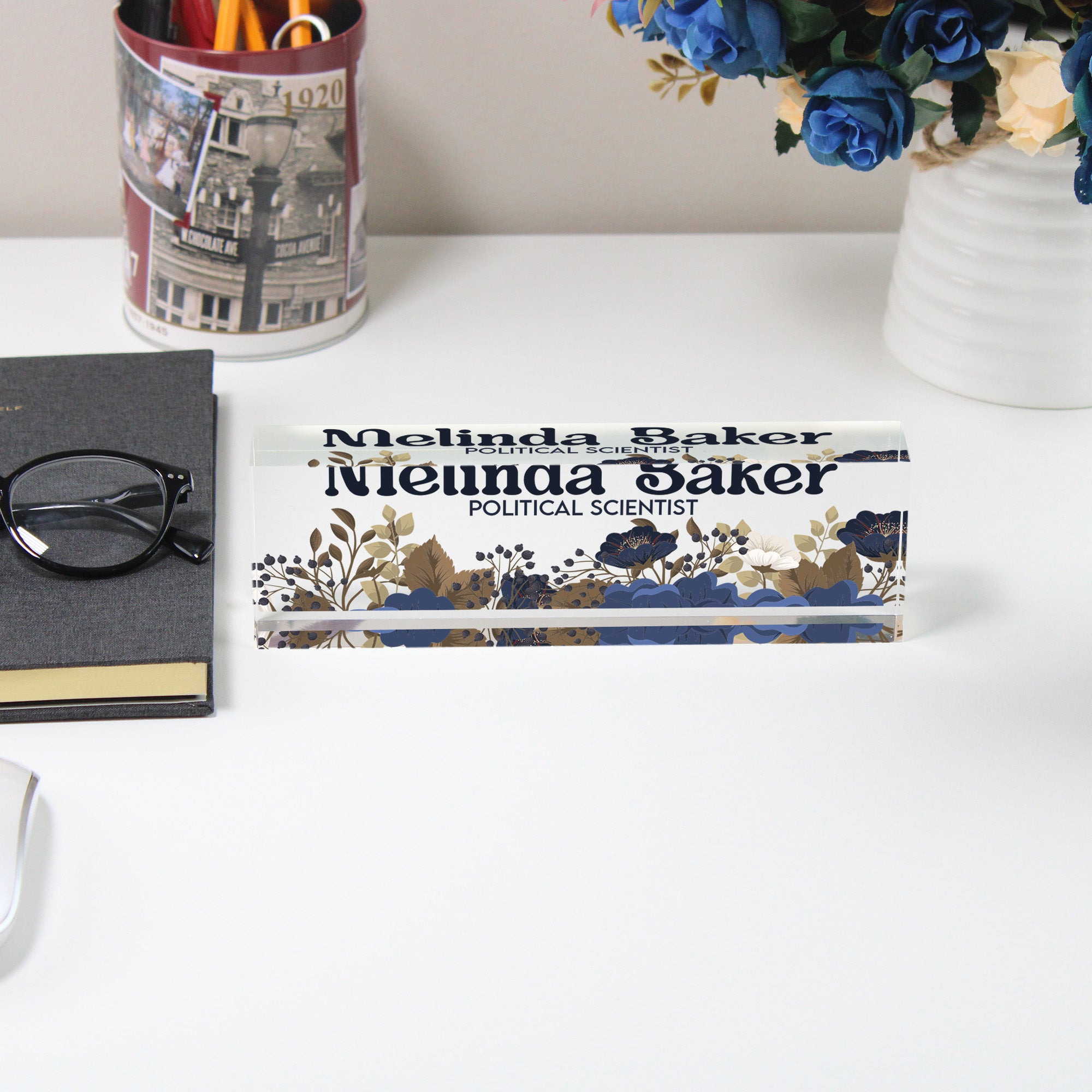 Enhance your workspace or delight a loved one with this exquisite Custom Acrylic Desk Block. Handcrafted with precision, this elegant nameplate features a stunning floral design in rich blues and golds, elegantly pairing with the bold typography to showcase the recipient's name and title. The sophisticated combination of colors and intricate patterns ensures it stands out as a decorative highlight on any desk.