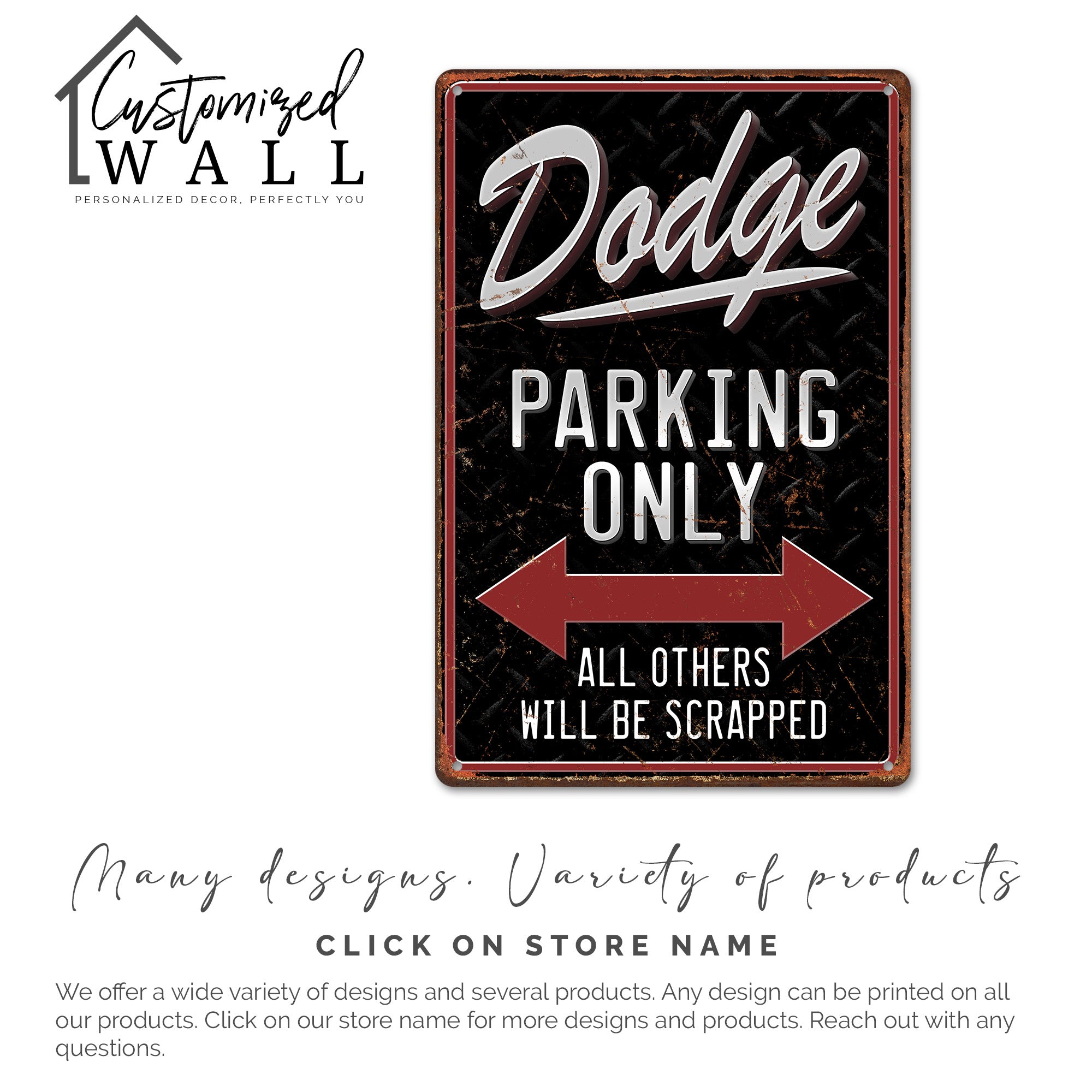 Elevate your garage or man cave with this stunning "Dodge Parking Only" metal sign. Crafted with precision from high-quality metal, the sign boasts a rugged yet stylish design featuring a chic black backdrop adorned with vintage-inspired text. Accented with bold red arrows, the sign boasts a weathered aesthetic that adds a classic touch to any space.