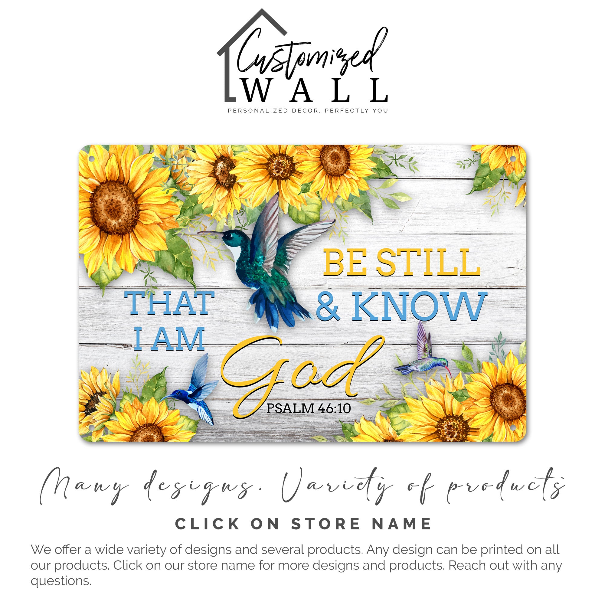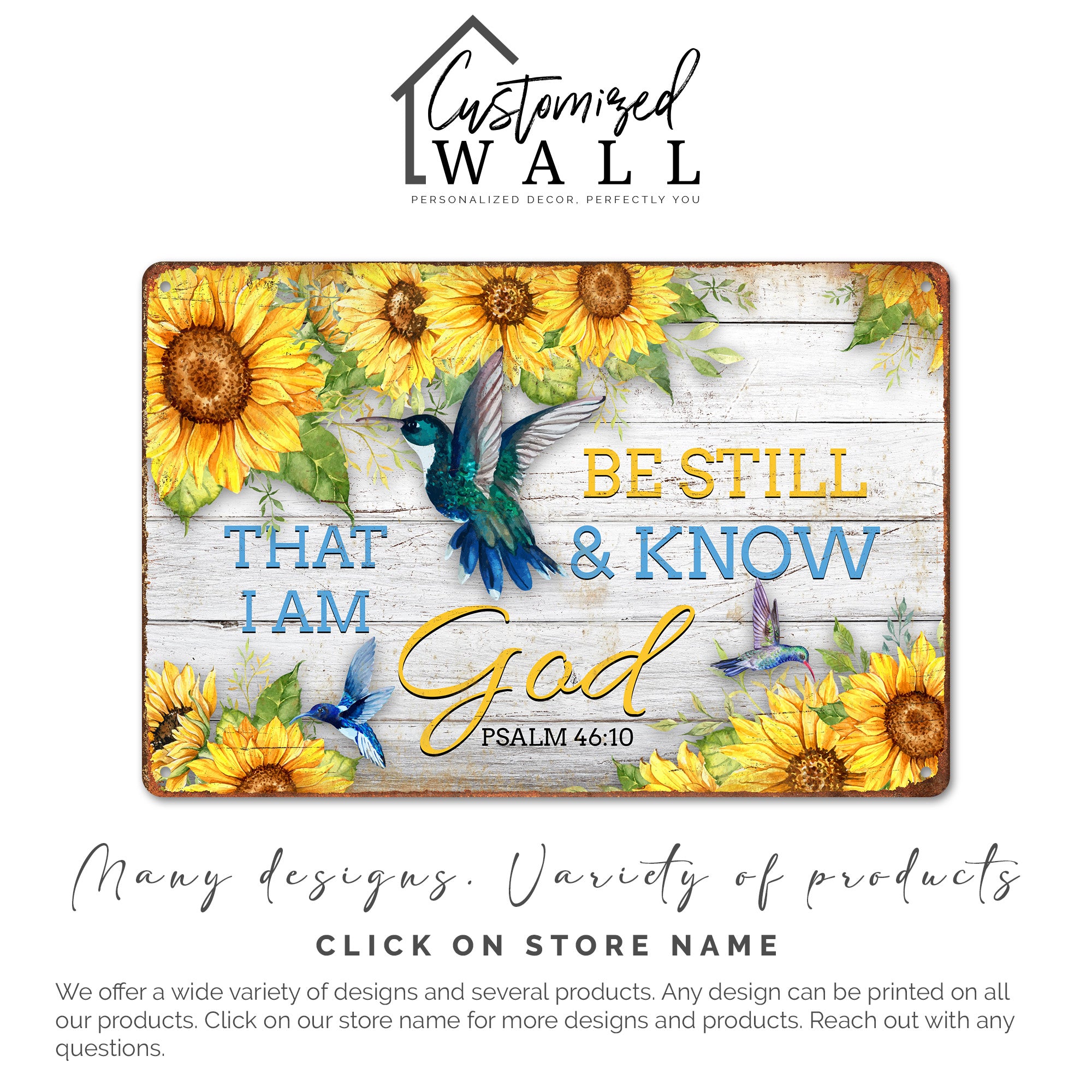 Bring serenity and beauty to your home with our personalized metal sign, featuring vibrant sunflowers and graceful hummingbirds against a rustic wood-textured backdrop. The inspiring message "Be Still & Know That I Am God" from Psalm 46:10 is elegantly displayed in mixed typography, blending soothing shades of yellow and blue, and offering a touching reminder of peace and faith.