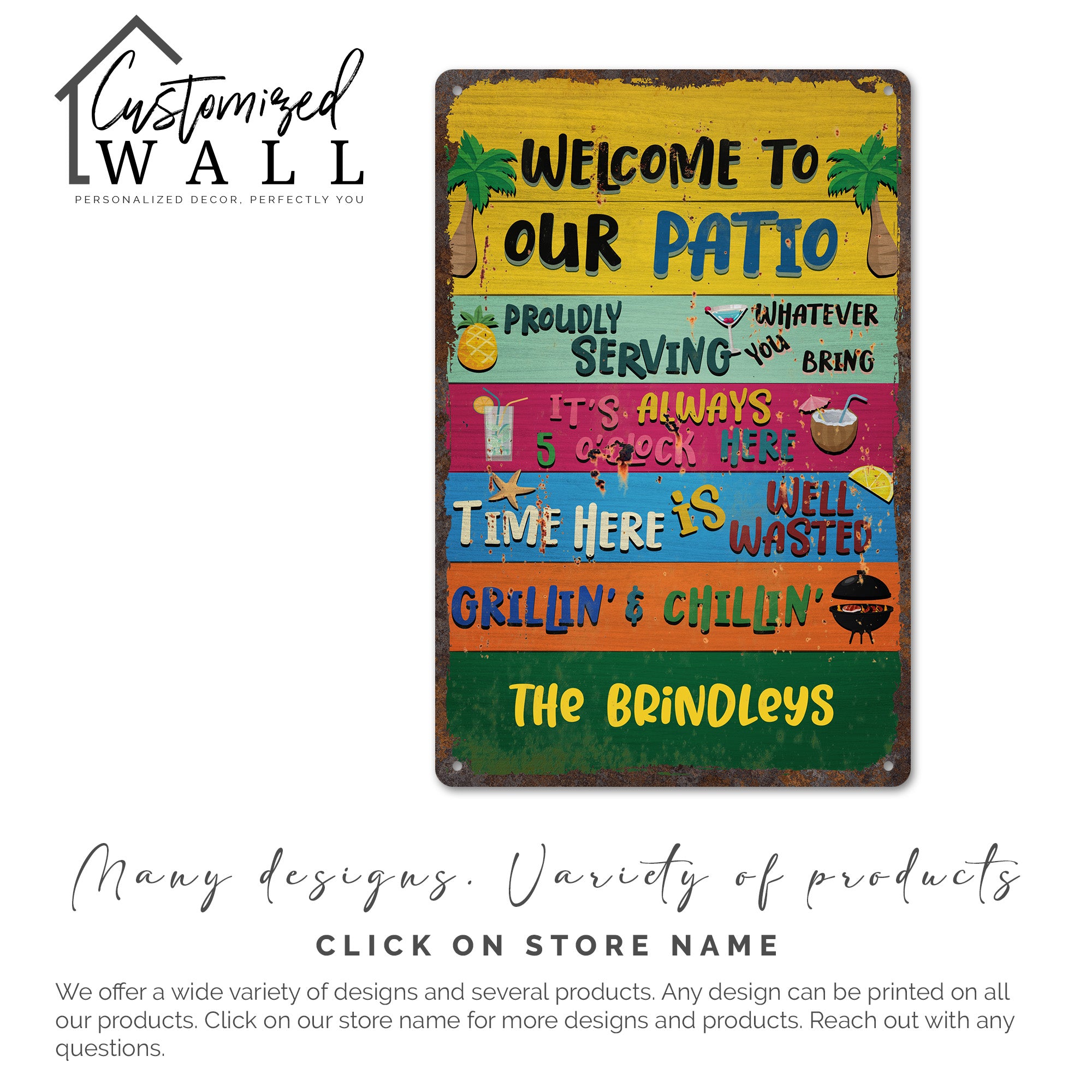 custom metal sign, personalized patio sign, outdoor decor, grill lover gift, handmade sign, party host gift, family name sign, backyard barbecue, rustic decor, colorful patio sign, personalized gift, housewarming gift, vintage metal sign, custom outdoor decor, mom gift