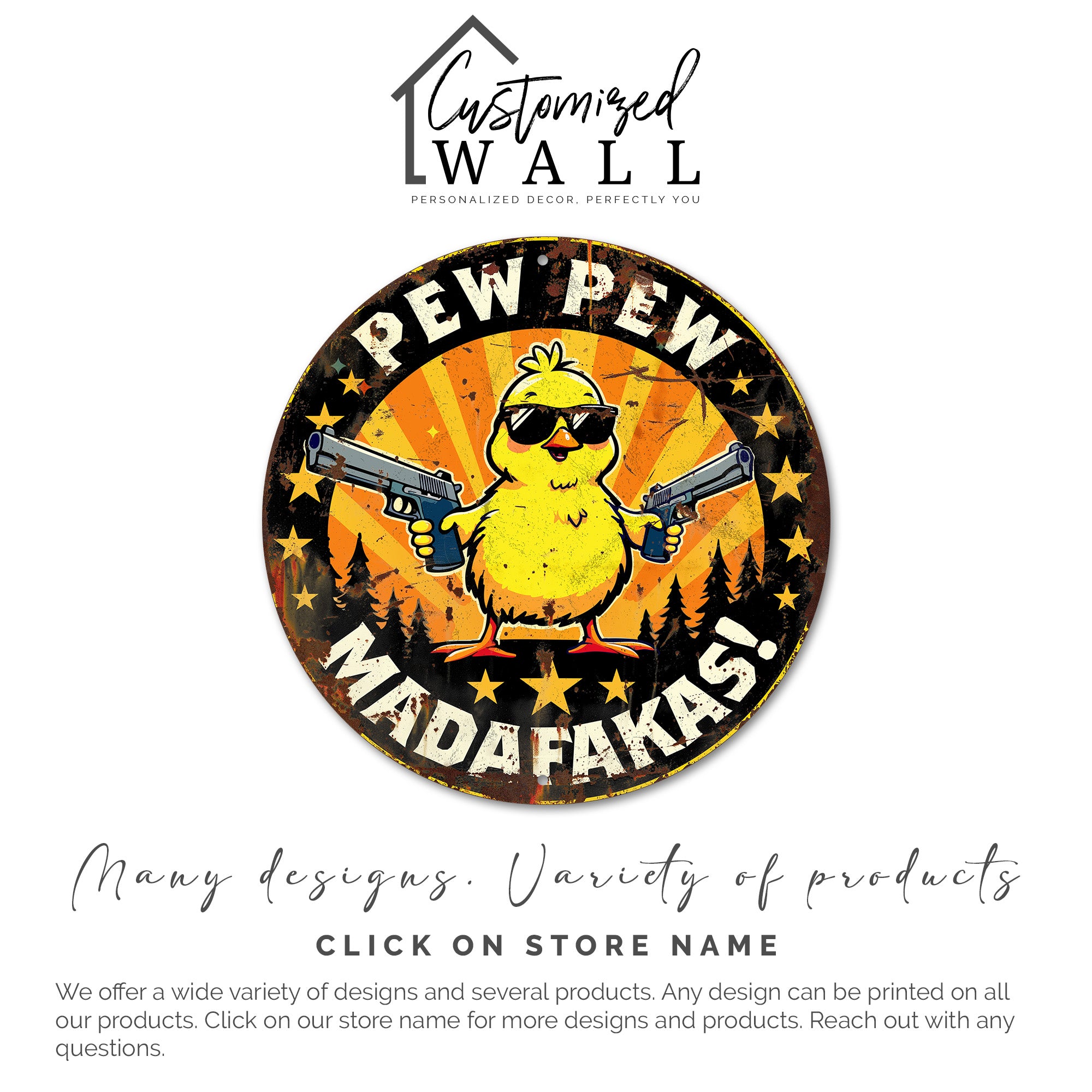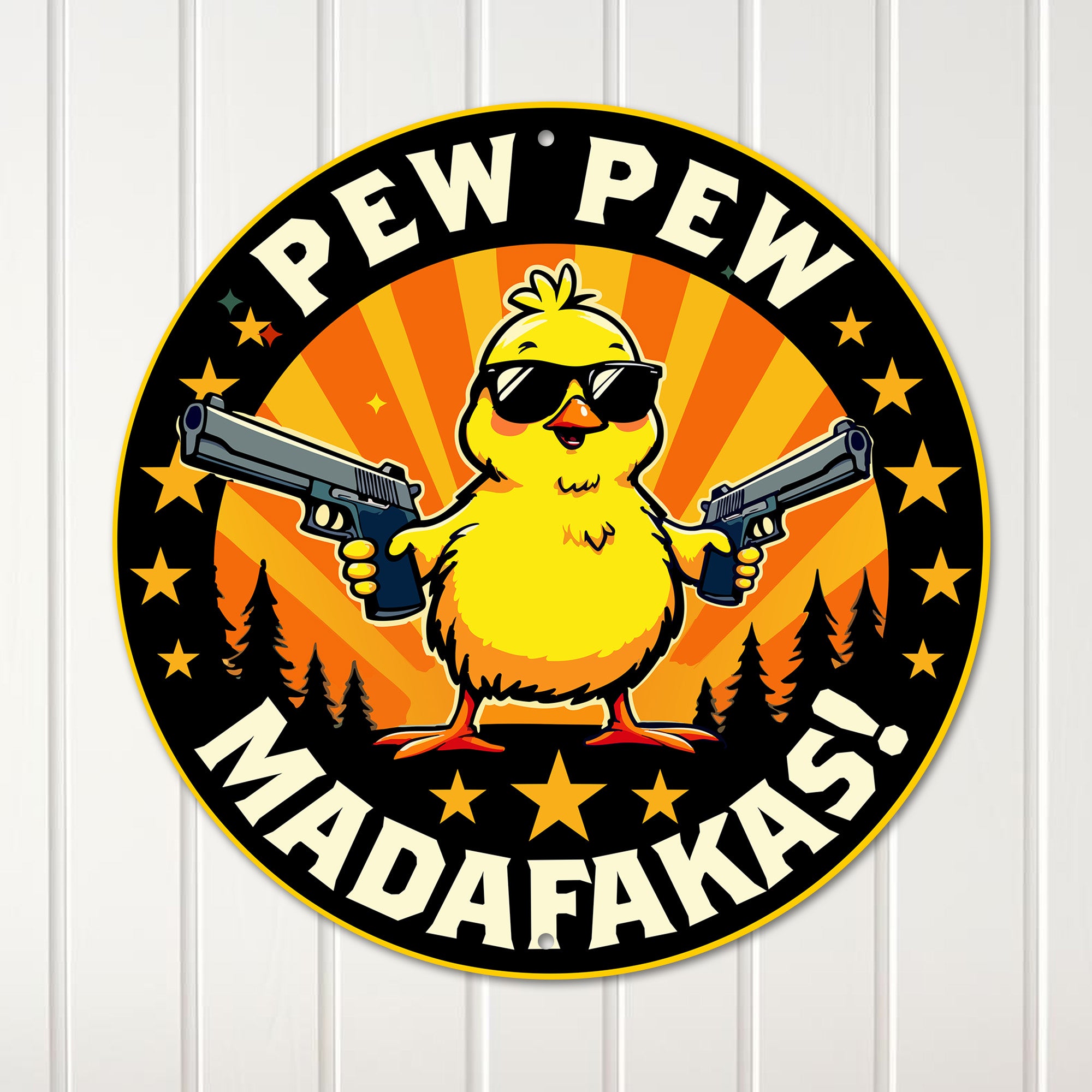 Elevate your space with this eye-catching round metal sign featuring a vibrant and playful design that is sure to bring a smile to anyone's face. Our exclusive "Pew Pew Madafakas" sign showcases a cheeky yellow chicken sporting cool shades and holding two toy guns, set against a bold orange and black starry background. This humorous and charming piece is perfect for adding a touch of whimsy to any room.