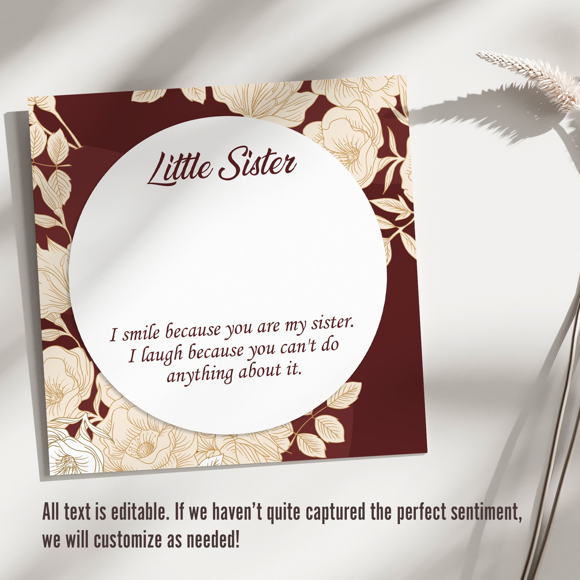 Encased in a meticulously designed gift box, the message card reads, "I smile because you are my sister. I laugh because you can't do anything about it." This humorous and heartfelt message is printed over a rich burgundy and floral background, creating a visually striking presentation.