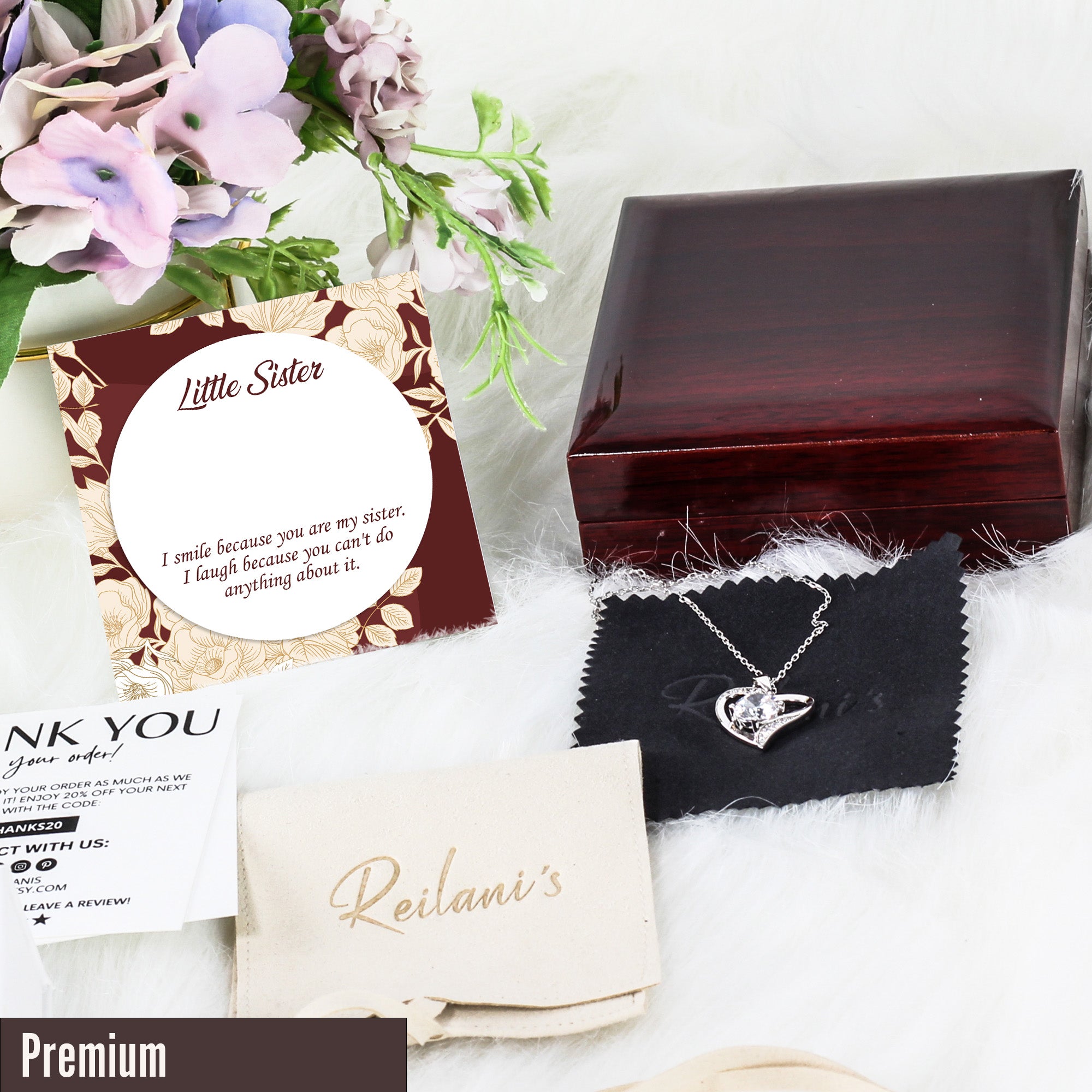 **TAGS:** sister gift, little sister necklace, personalized jewelry, sterling silver, knot necklace, sentimental gift, birthday gift, sister birthday, cubic zirconia, gift for her, handmade necklace, elegant gift, family bond, custom message, special occasions
