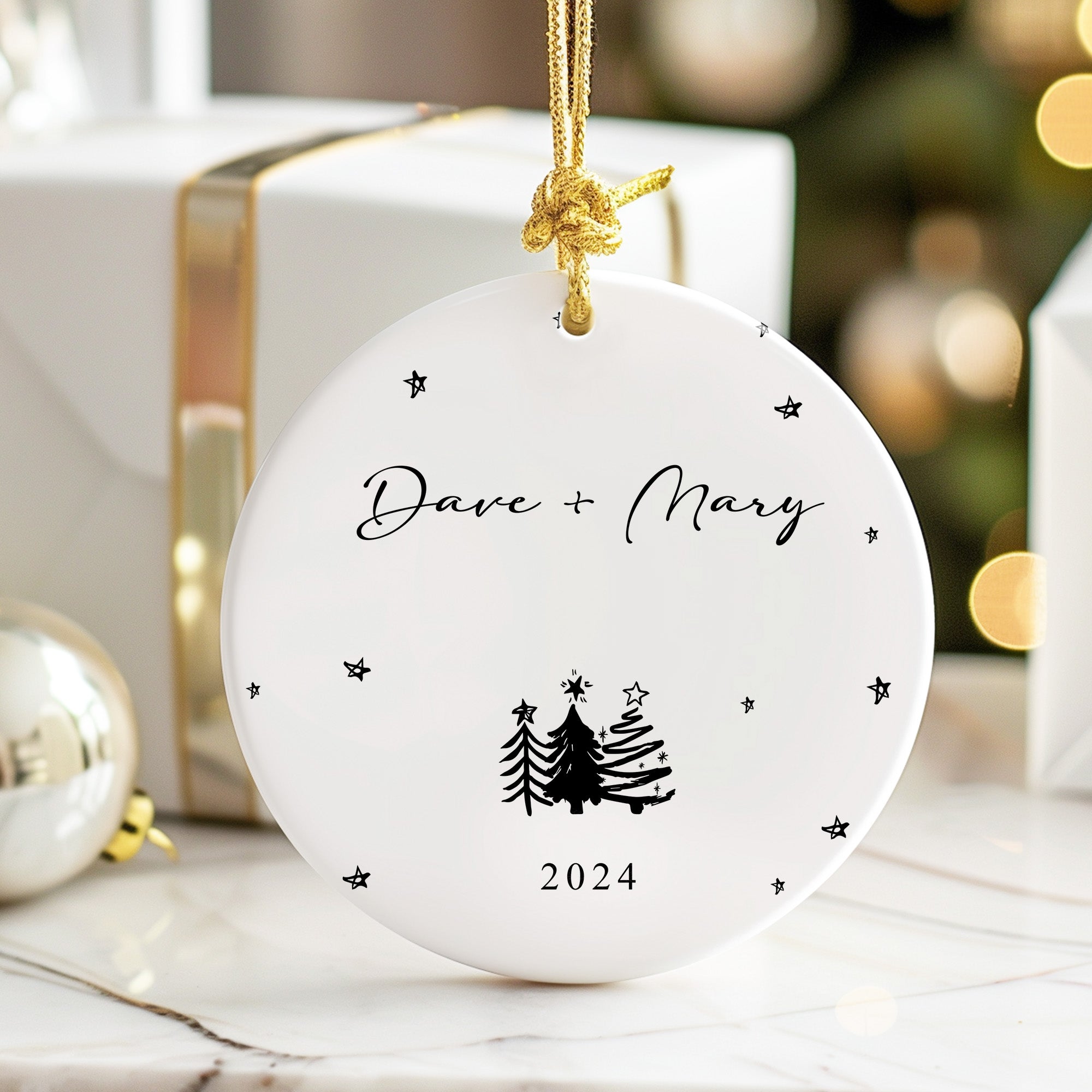 Featuring a minimalist design, the ornament displays delicate black stars surrounding hand-drawn holiday trees, adding a touch of whimsy and charm. The personalized names "Dave + Mary" are elegantly scripted above, offering a heartfelt connection, while the year "2024" anchors this as a memorable keepsake.