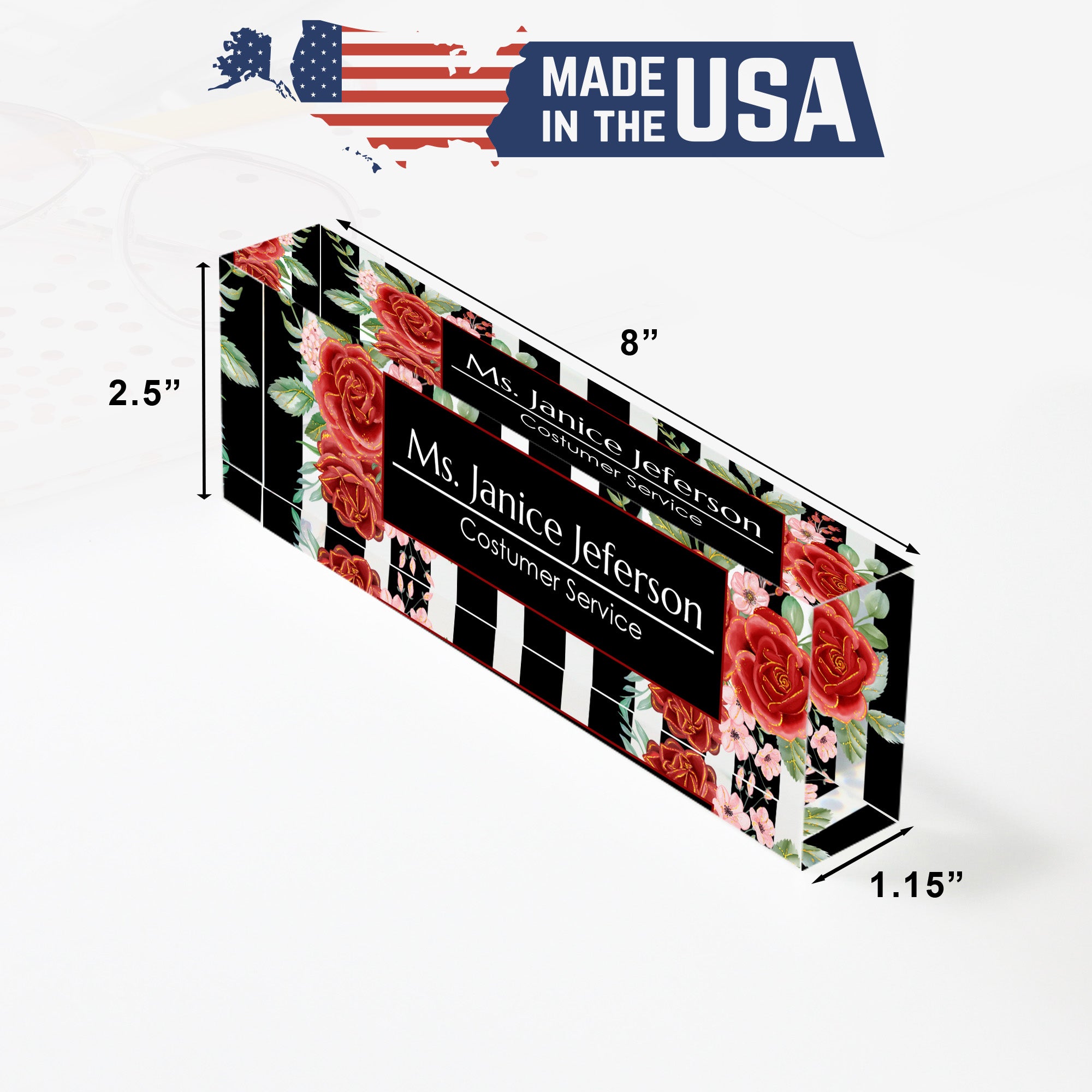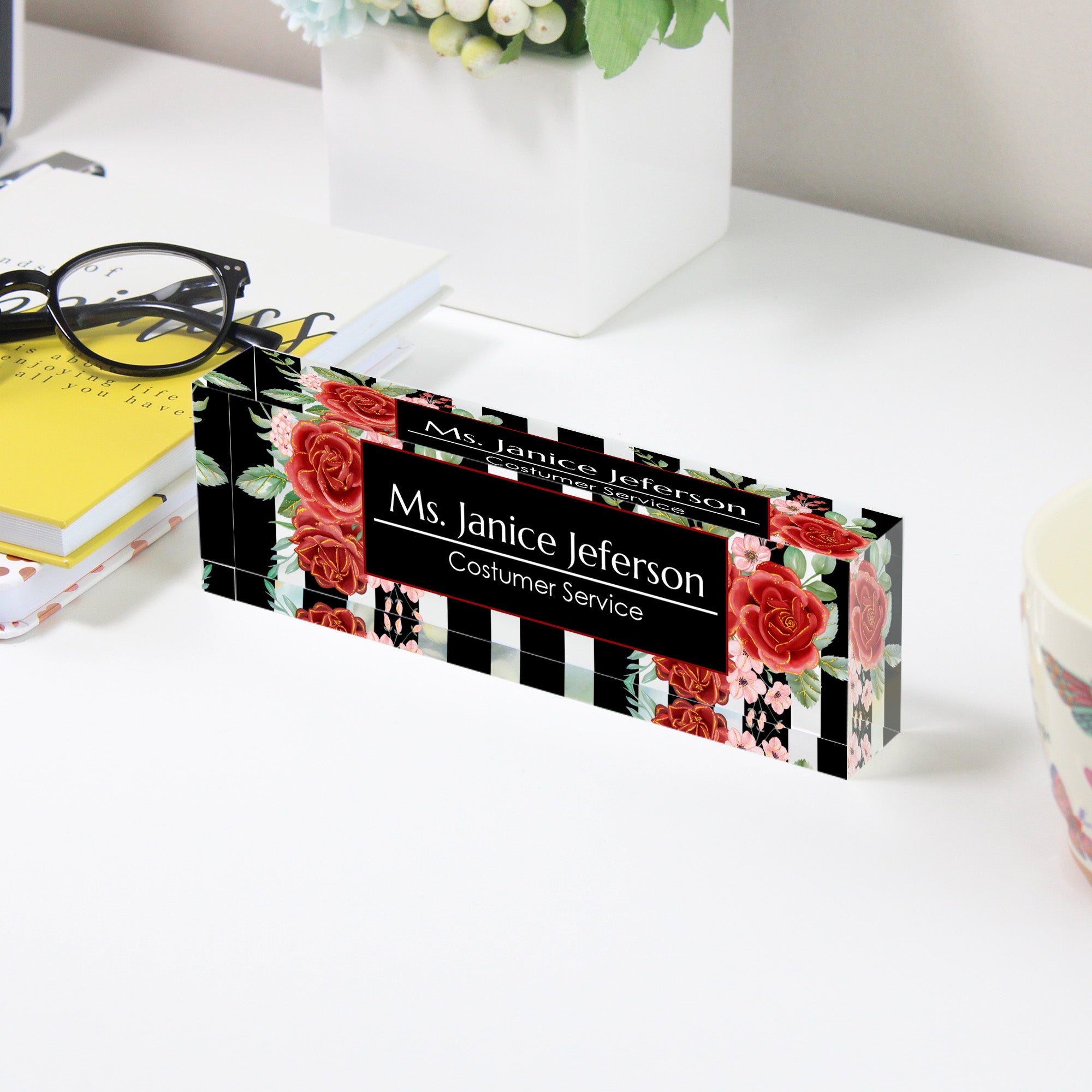 Enhance your workspace with our beautifully handcrafted acrylic desk block featuring a sophisticated black-and-white striped background adorned with vibrant rose and floral accents. This personalized nameplate, "Ms. Janice Jeferson," is designed for customer service professionals looking to add a touch of elegance and professionalism to their desk.
