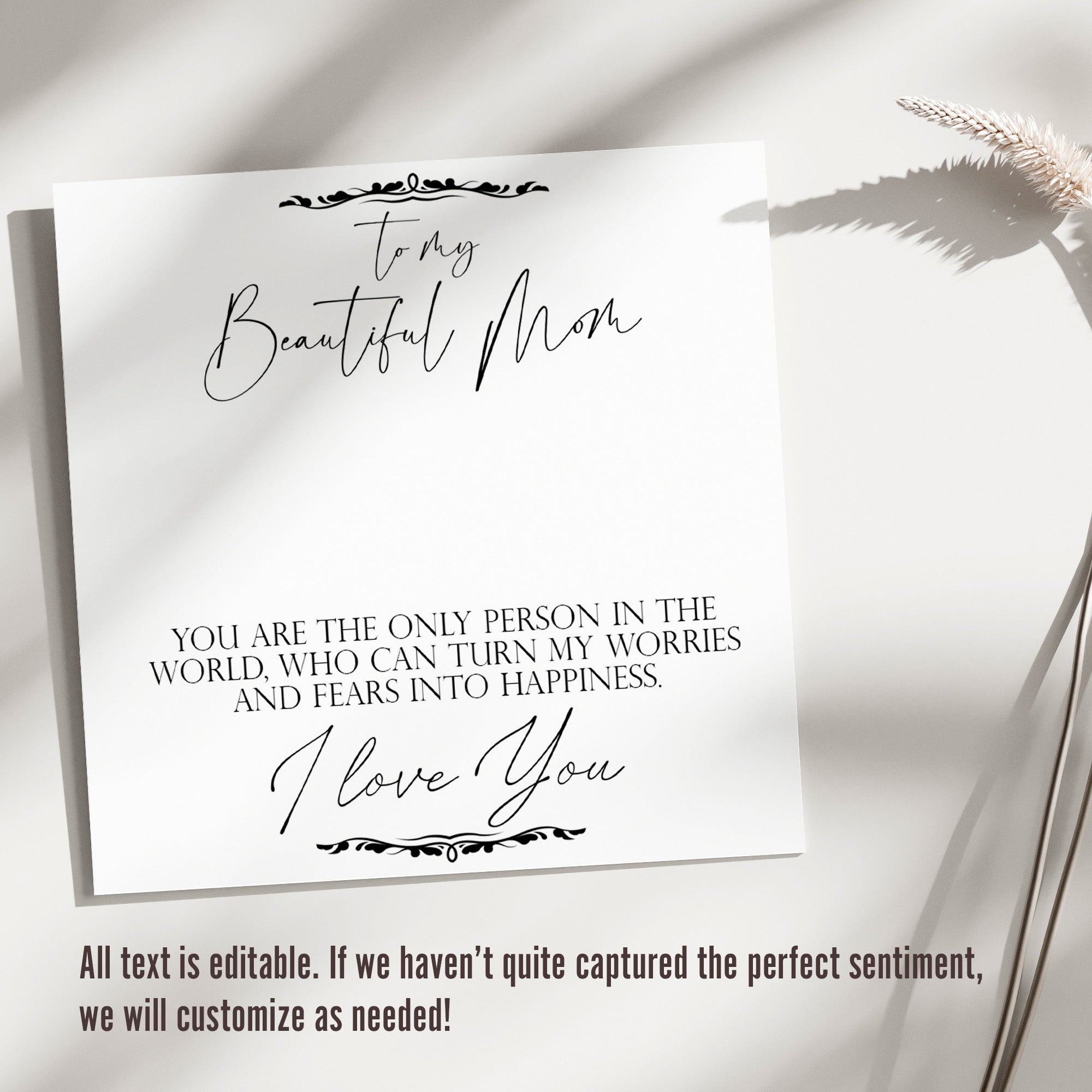 Personalization is at the heart of this necklace. The message card includes a heartfelt note: "To my Beautiful Mom – You are the only person in the world who can turn my worries and fears into happiness. I love you." Customize this card by adding your own special message to make it uniquely hers.