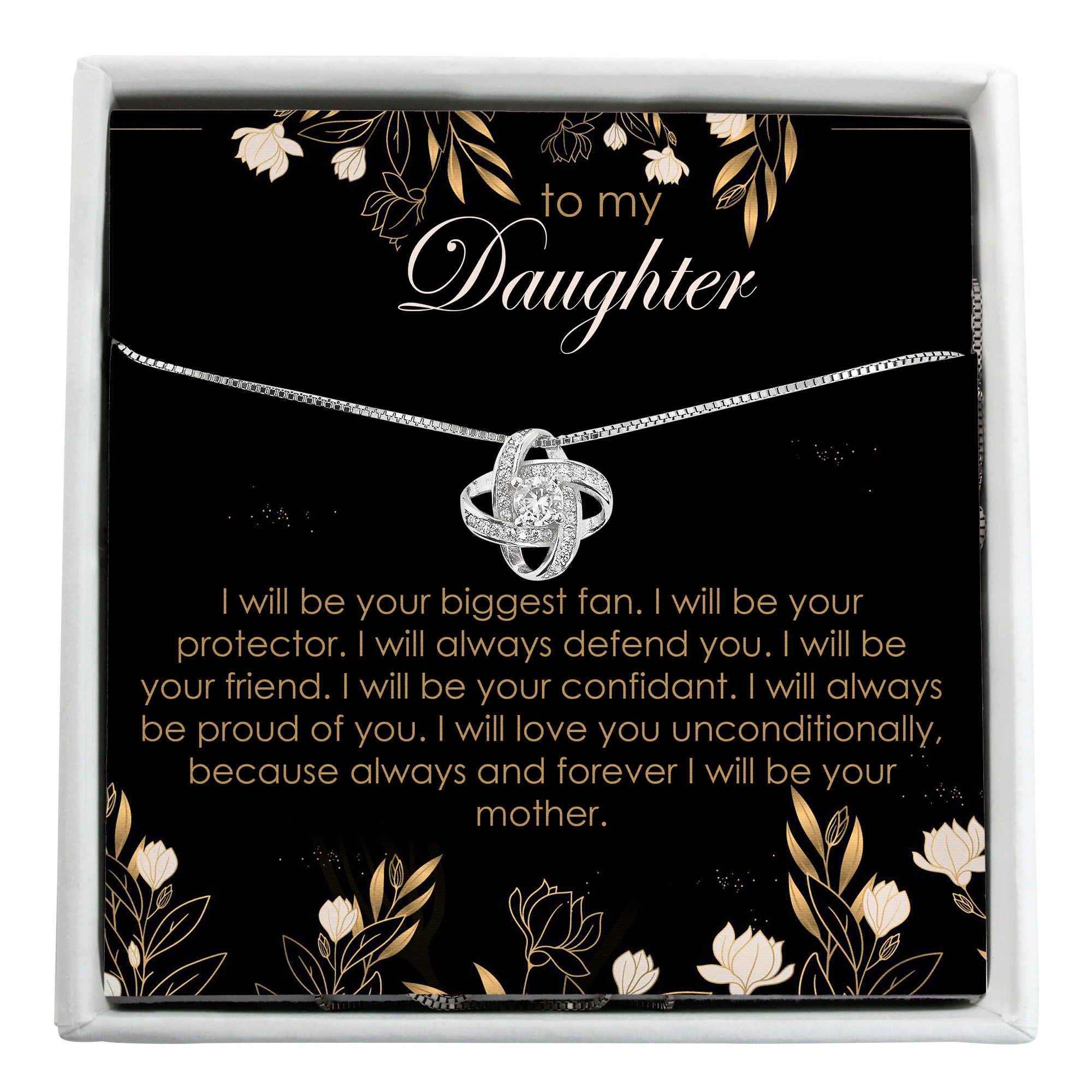 Surprise your daughter with a meaningful gift that she will cherish forever. This exquisite necklace combines an elegant sterling silver knot pendant with a heartfelt message card, offering a perfect blend of style and sentiment. The delicate chain and shimmering pendant form a classic and timeless piece, skillfully crafted to capture the everlasting bond between a mother and daughter.