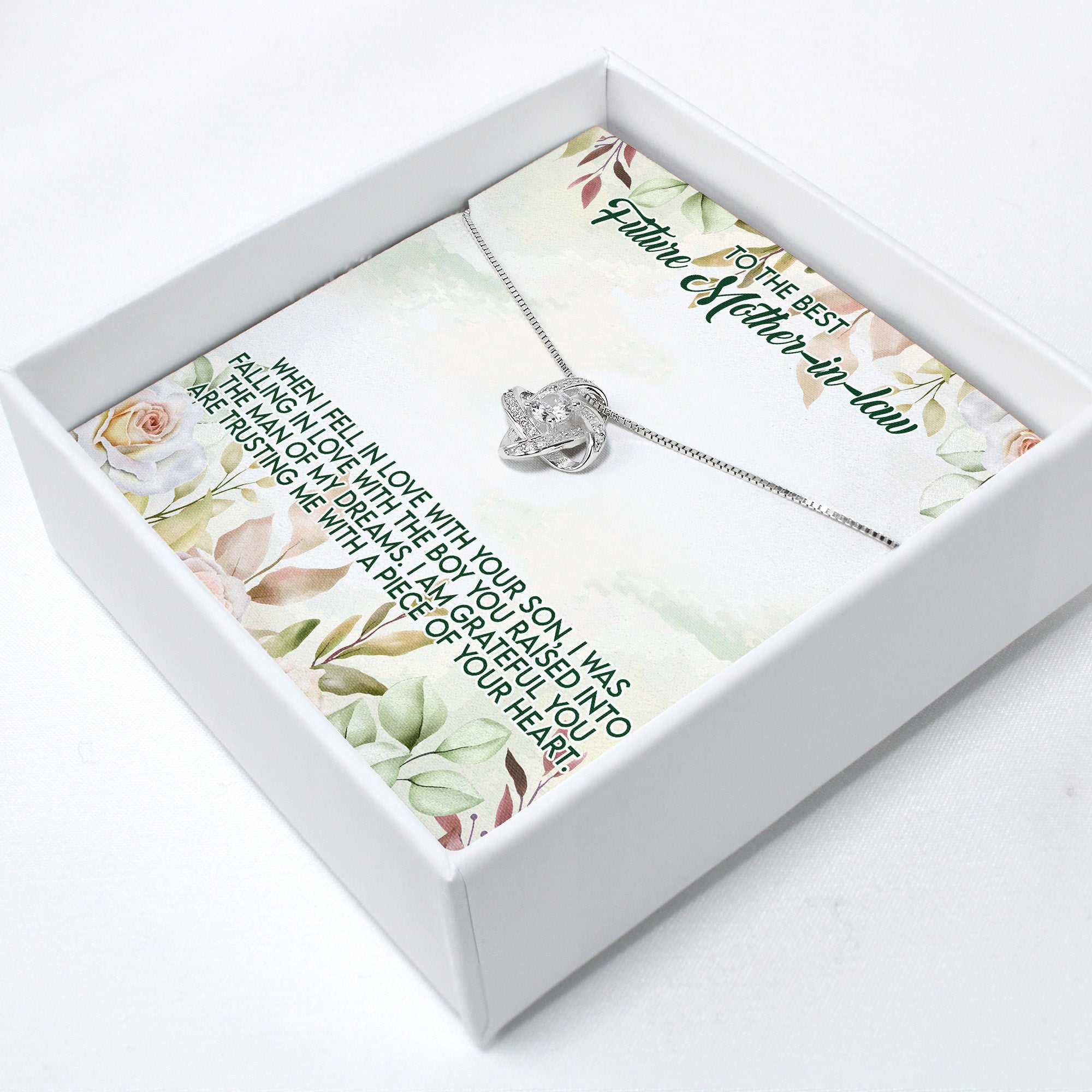 TAGS: personalized necklace, future mother-in-law gift, wedding jewelry, engagement present, family bond, sterling silver necklace, heartfelt gift, cubic zirconia, custom jewelry, sentimental keepsake, thoughtful present, mother-in-law appreciation, personalized message card, wedding accessory, handmade jewelry