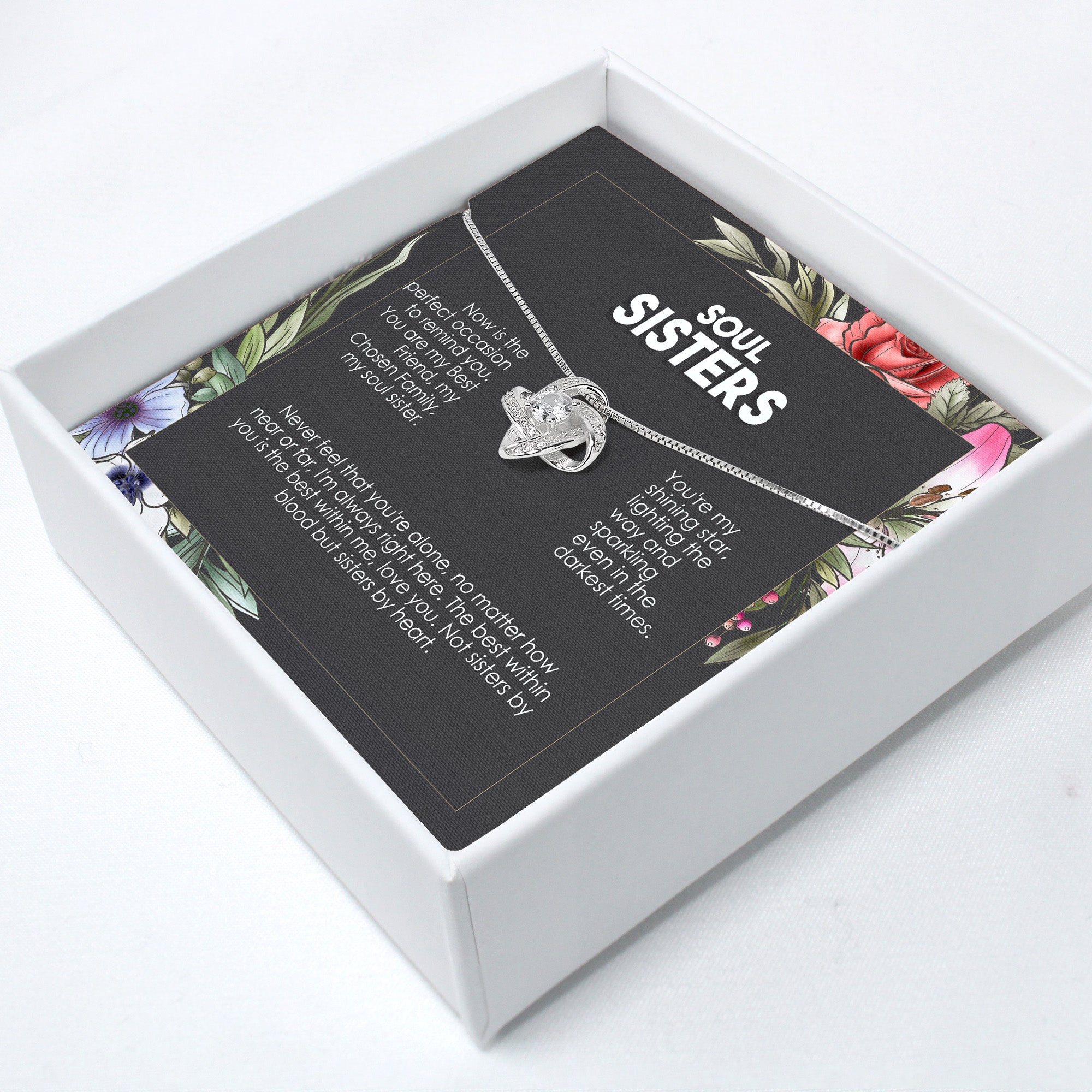 TAGS: soul sister necklace, personalized gift, handmade jewelry, best friend gift, sister jewelry, knot necklace, friendship necklace, gift for her, special occasion gift, floral message card, emotional connection, gift for sister, gift for best friend, meaningful jewelry, personalized keepsake