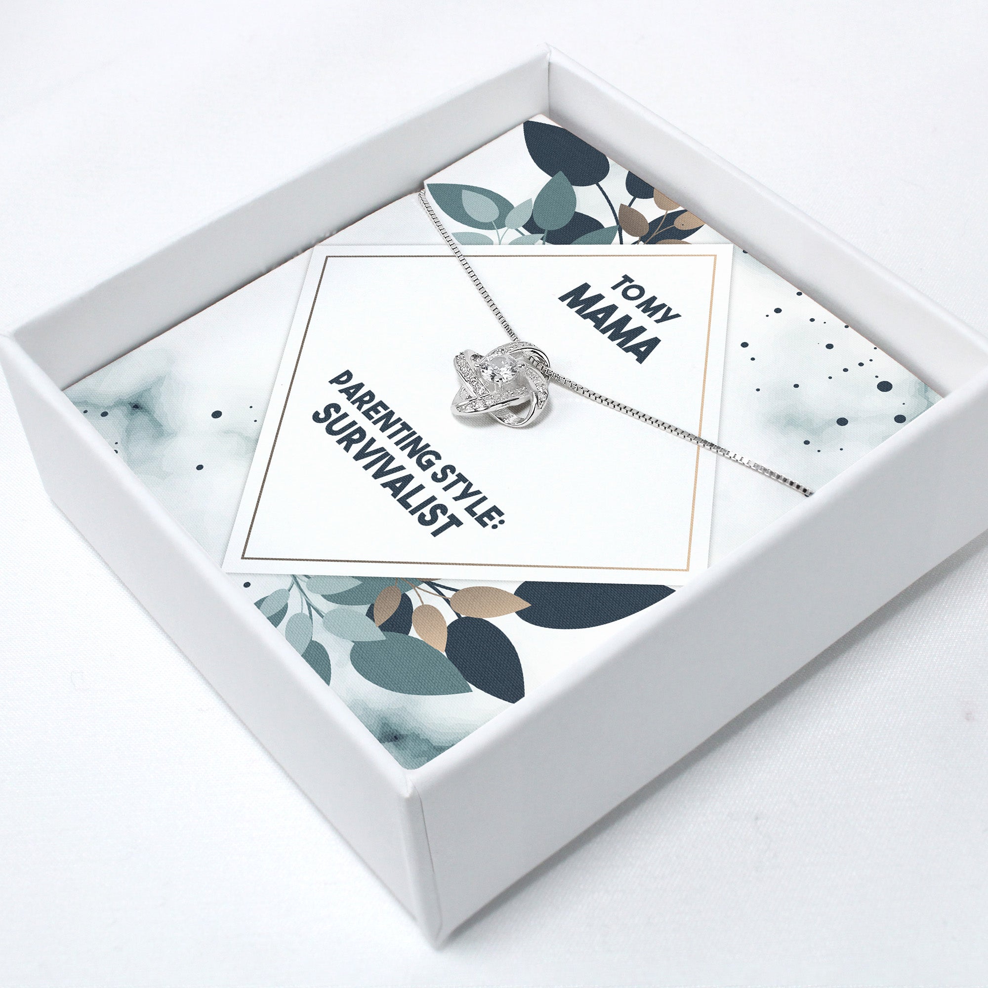 TAGS: personalized jewelry, mother's day gift, mama necklace, survivalist gift, sterling silver necklace, knot pendant, gift for mom, handmade gift, birthday gift for mom, sentimental jewelry, elegant necklace, meaningful gift, gift for her, mother appreciation, custom message card