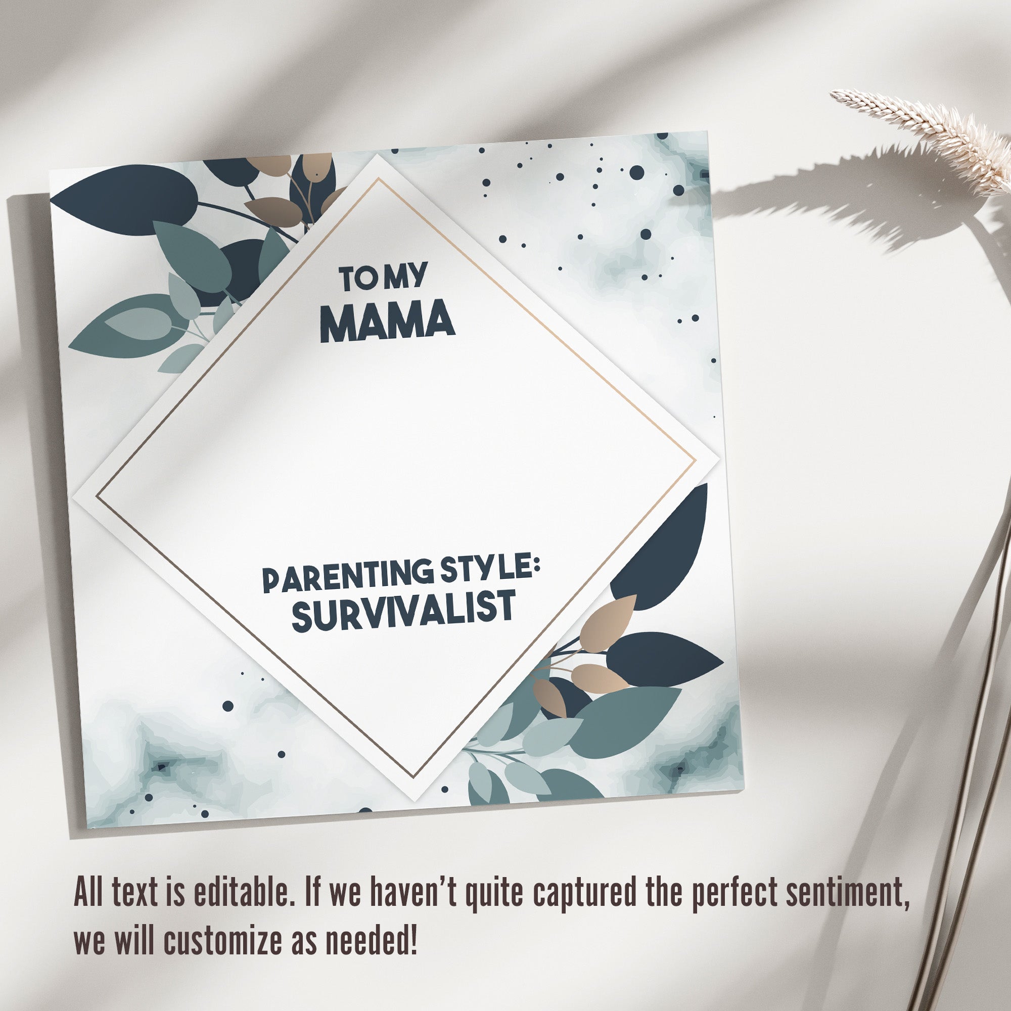The accompanying message card, nestled within a beautifully designed box, celebrates your mama's unique parenting style with a touch of humor. The soft hues of teal and navy, adorned with artistic leaf patterns, create a sophisticated backdrop that enhances the heartfelt message: "Parenting Style: Survivalist." This thoughtful touch not only conveys warmth and appreciation but also adds a personal touch to your gift.