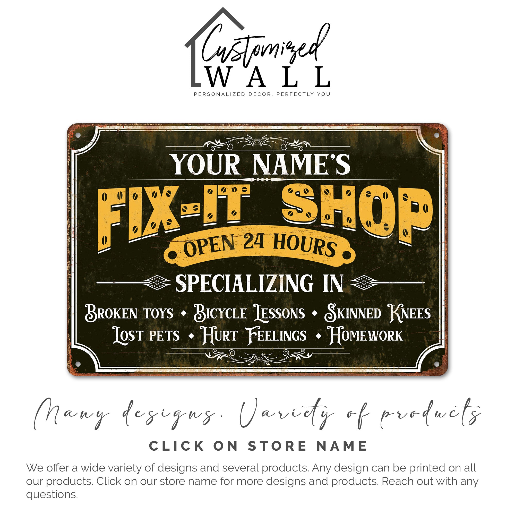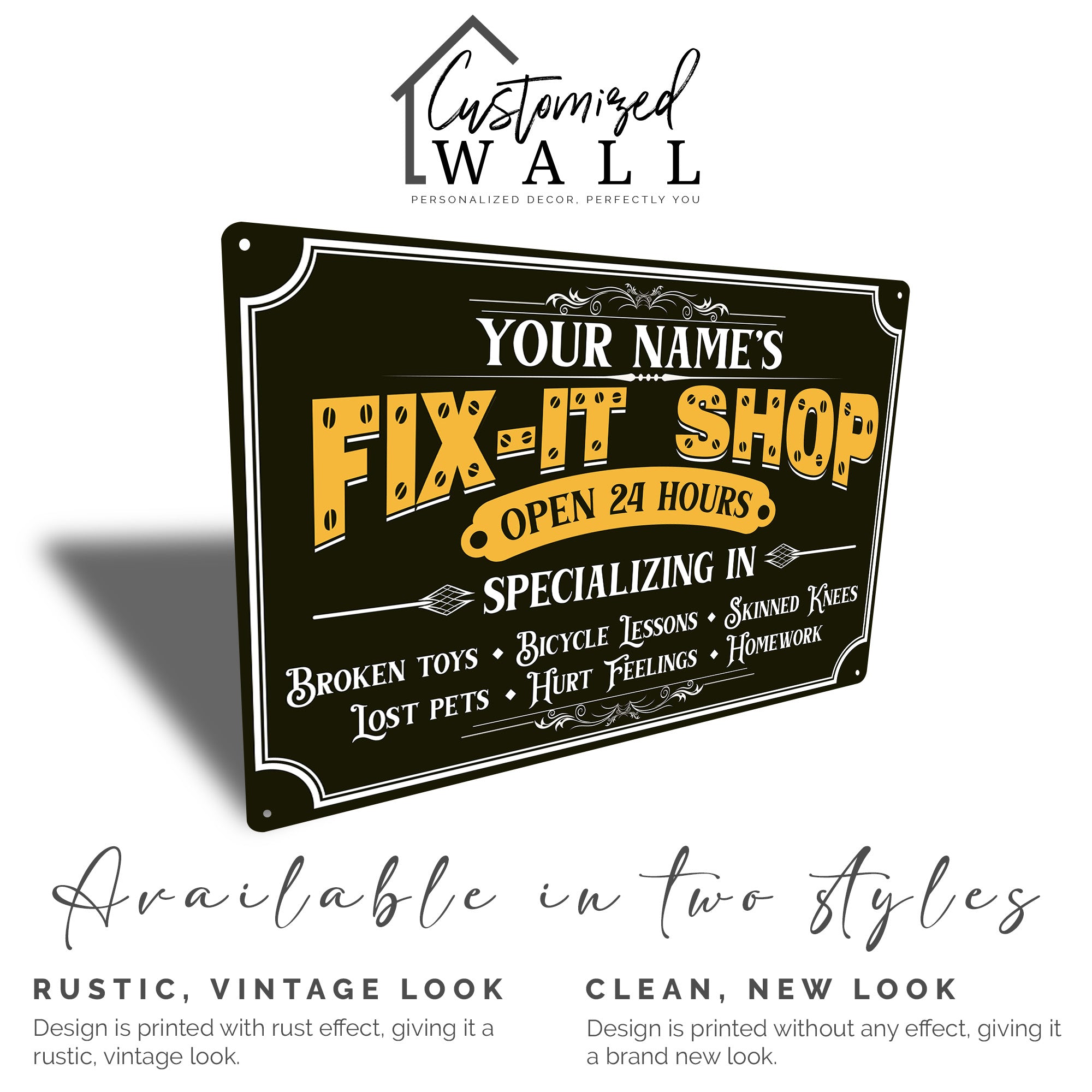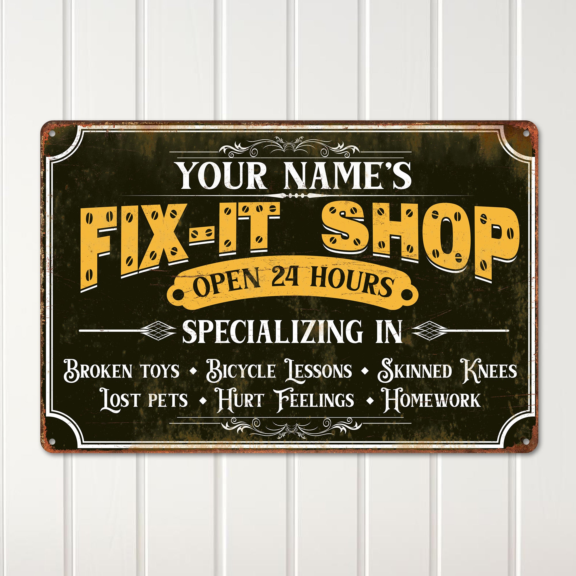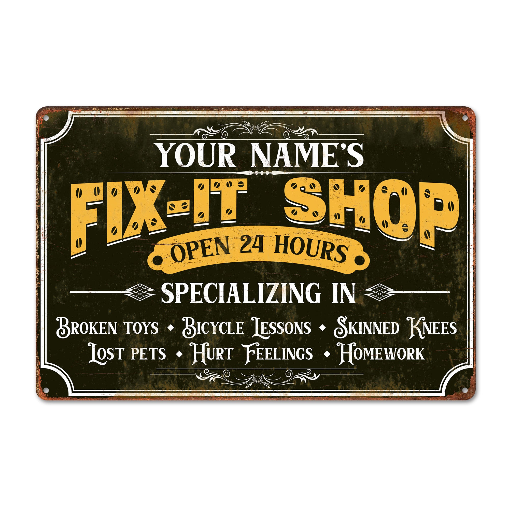 **TAGS**: personalized sign, vintage metal sign, fix-it shop, dad gift, handyman decor, workshop sign, custom gift, Father’s Day present, rustic decor, garage art, custom name sign, gift for handyman, personalized gift for him, unique dad gift, metal wall decor.
