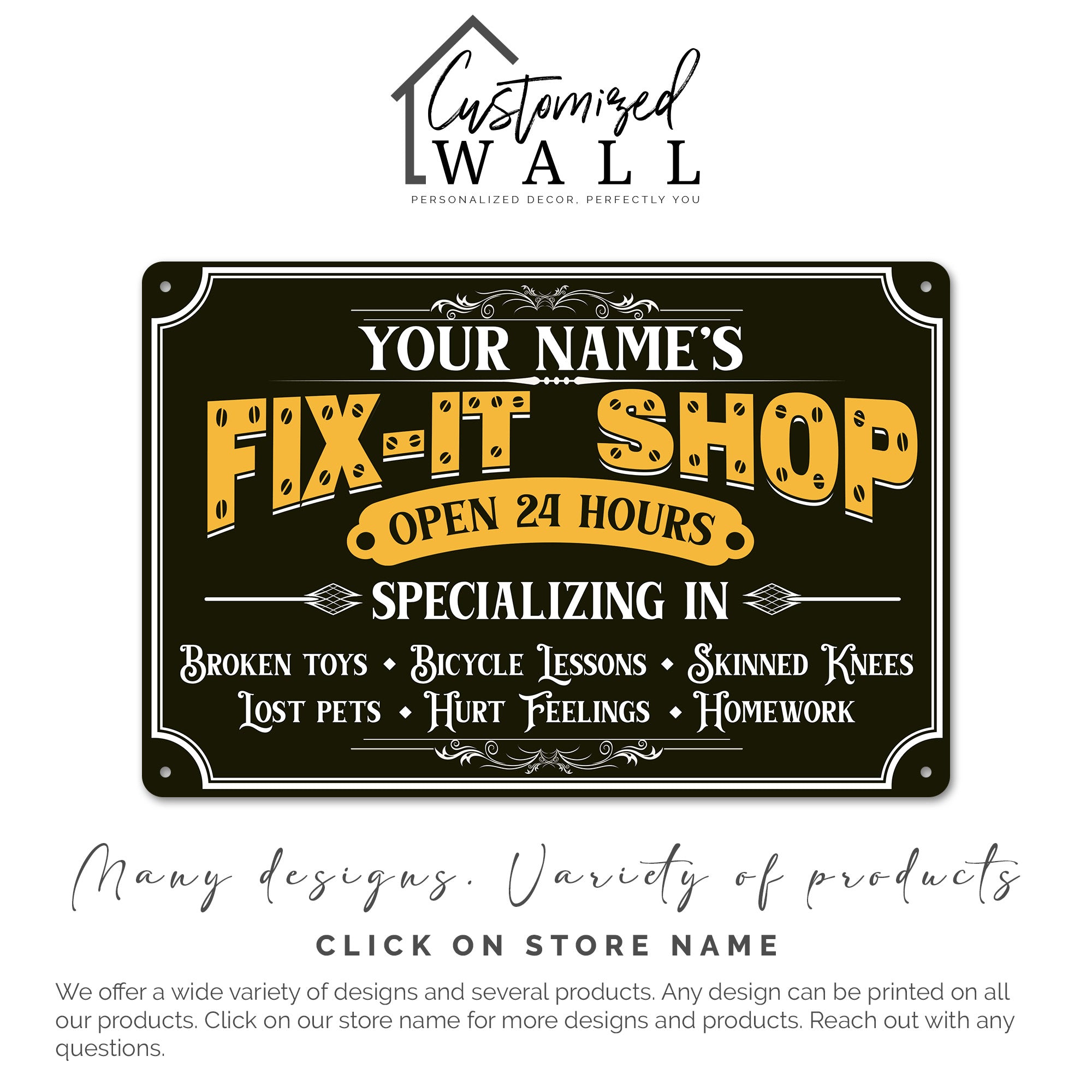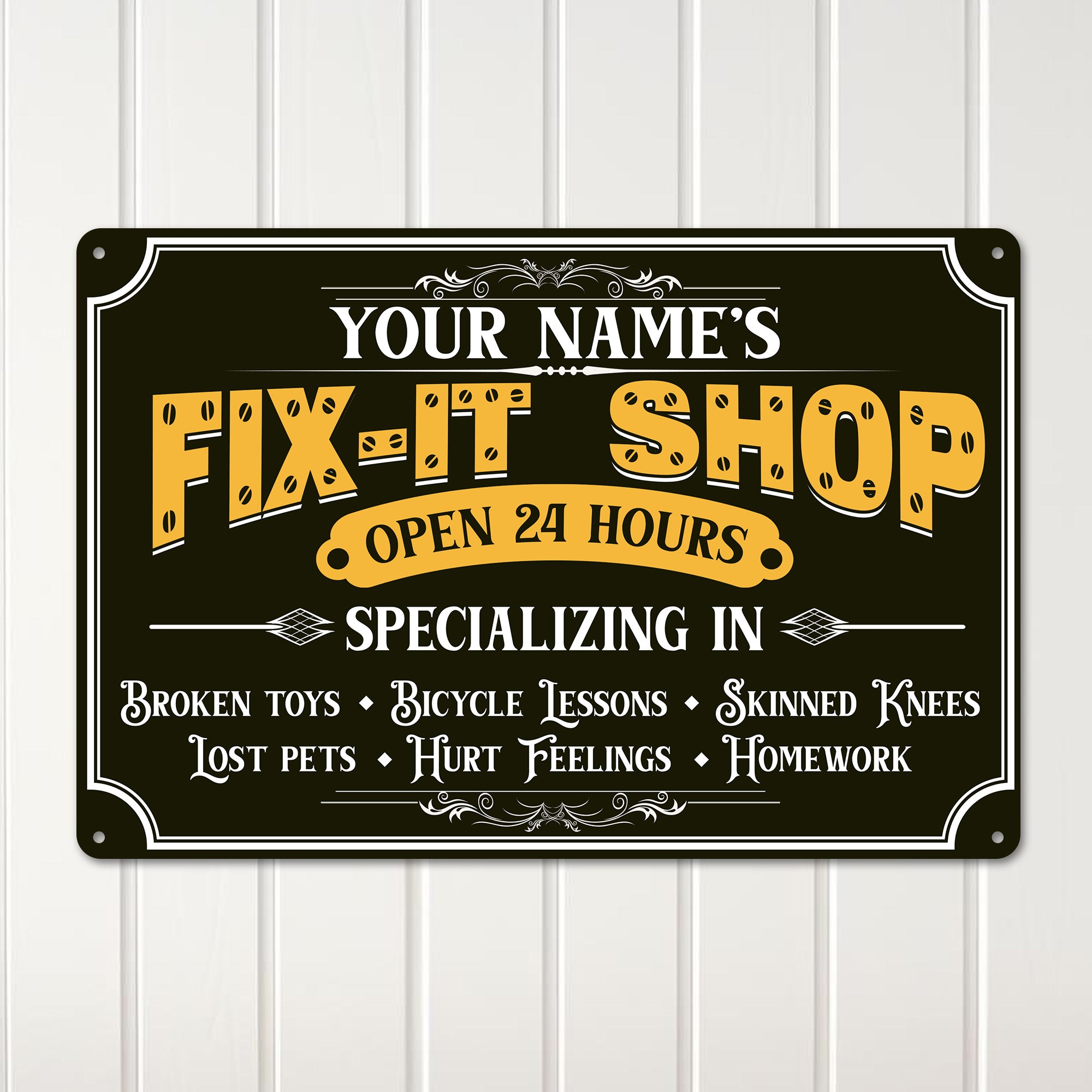Connect with loved ones by marking a special space as the "Fix-It Shop" where memories are made. Whether it’s fixing toys, teaching bicycle lessons, or offering life advice, this sign symbolizes a space where care and expertise come together.