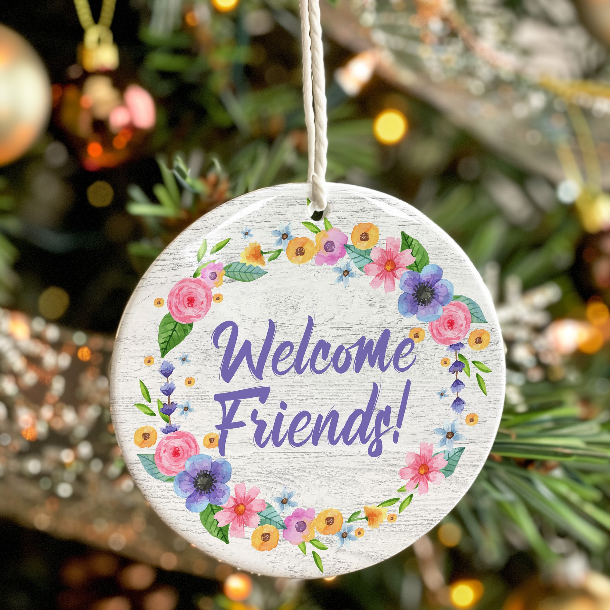 Welcome your guests with warmth and charm with our beautifully crafted "Welcome Friends!" Ceramic Ornament. This round ornament features a vibrant floral wreath design, showcasing a delightful blend of pink, purple, yellow, and orange blooms. The lush colors and intricate details celebrate the beauty of nature, adding a touch of elegance to any space.