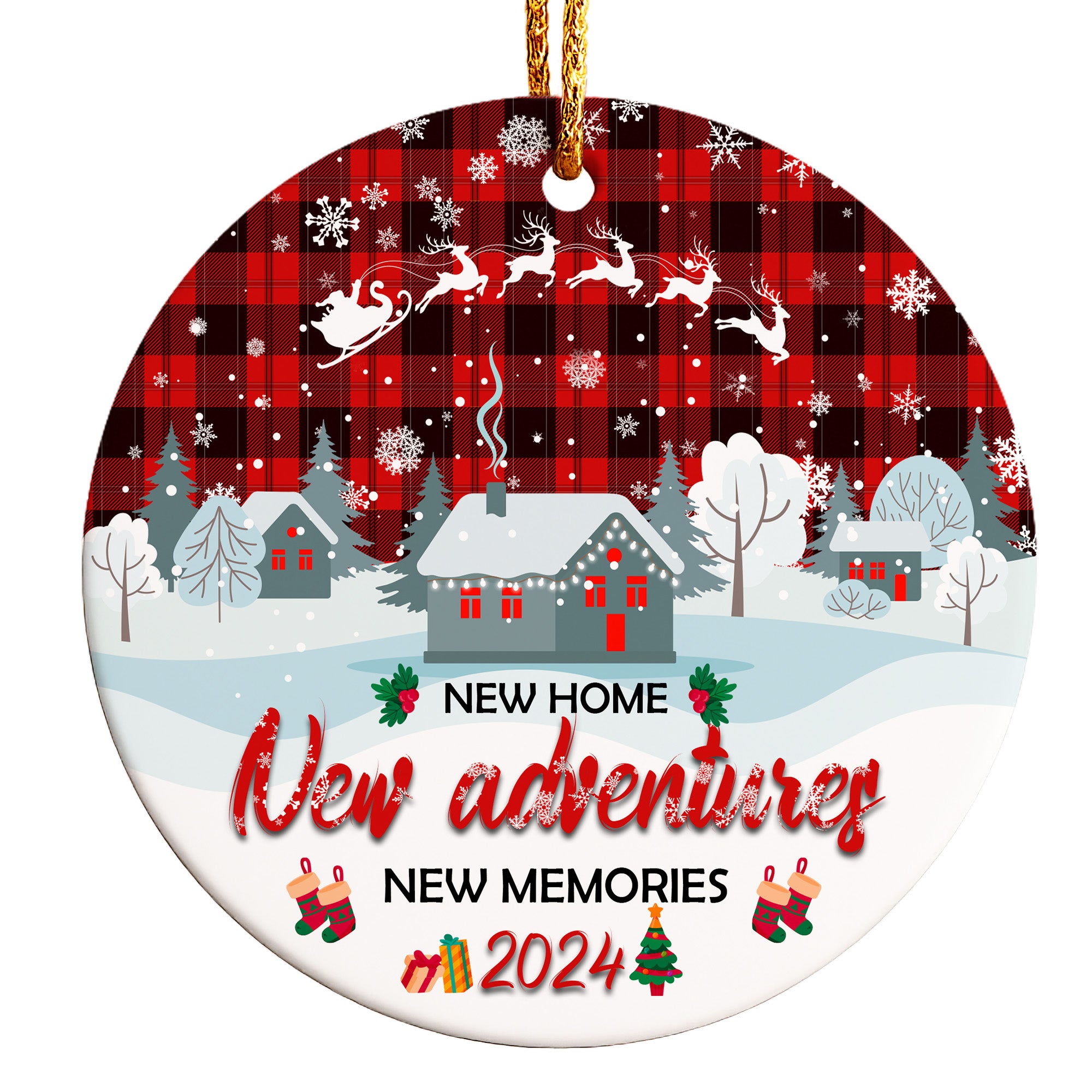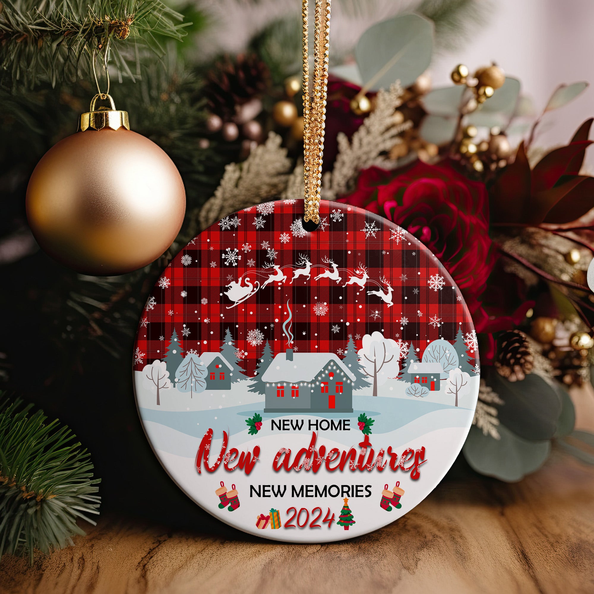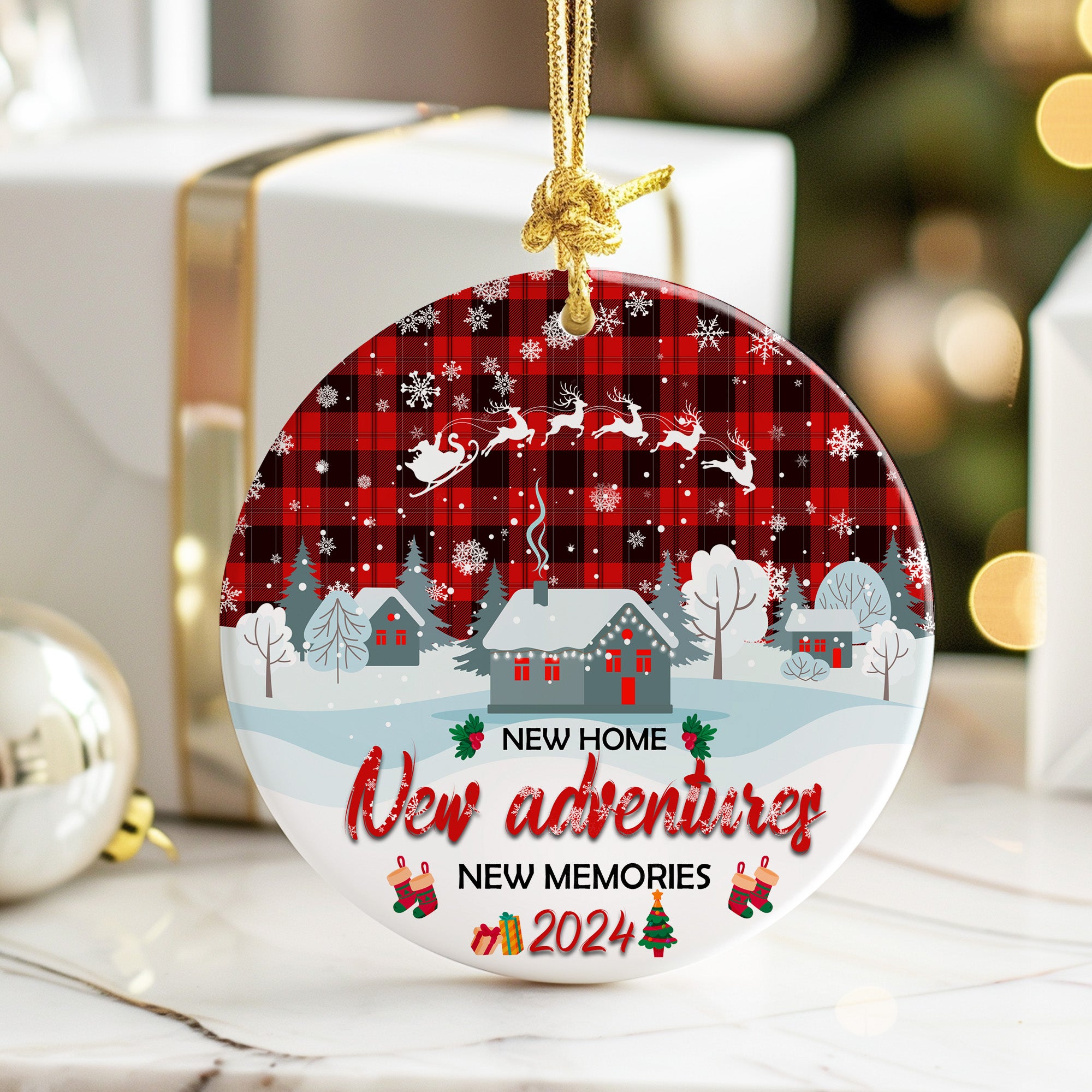 Celebrate the joy of moving into a new home with our beautifully crafted "New Adventures 2024" ceramic ornament. This festive piece features a cozy winter village scene with charming houses nestled among snow-covered trees, set against a traditional red plaid background. Santa's sleigh glides through the starry sky, adding a whimsical touch to your holiday decor.