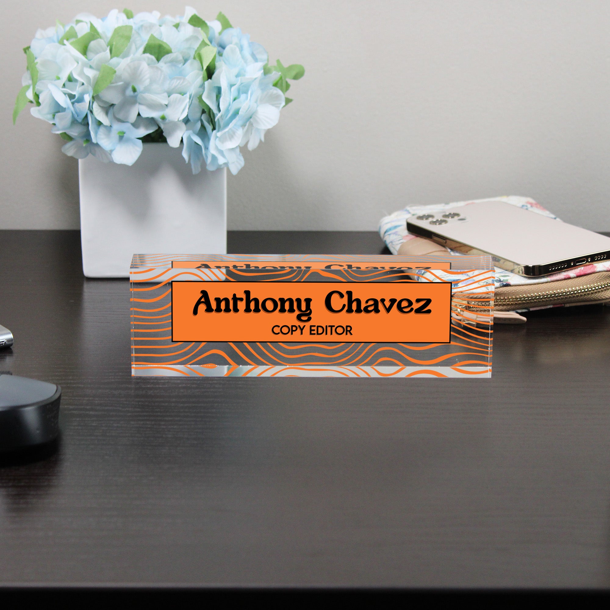 Crafted from high-quality acrylic, this desk block offers impressive durability with a crystal-clear finish that highlights the vibrant orange and black color scheme. The unique wave design adds a touch of creativity, making it a perfect fit for anyone who values aesthetics and organization. The bold black text, expertly etched, proudly displays the name "Anthony Chavez" and the professional title "COPY EDITOR," serving as a smart and personalized identifier.
