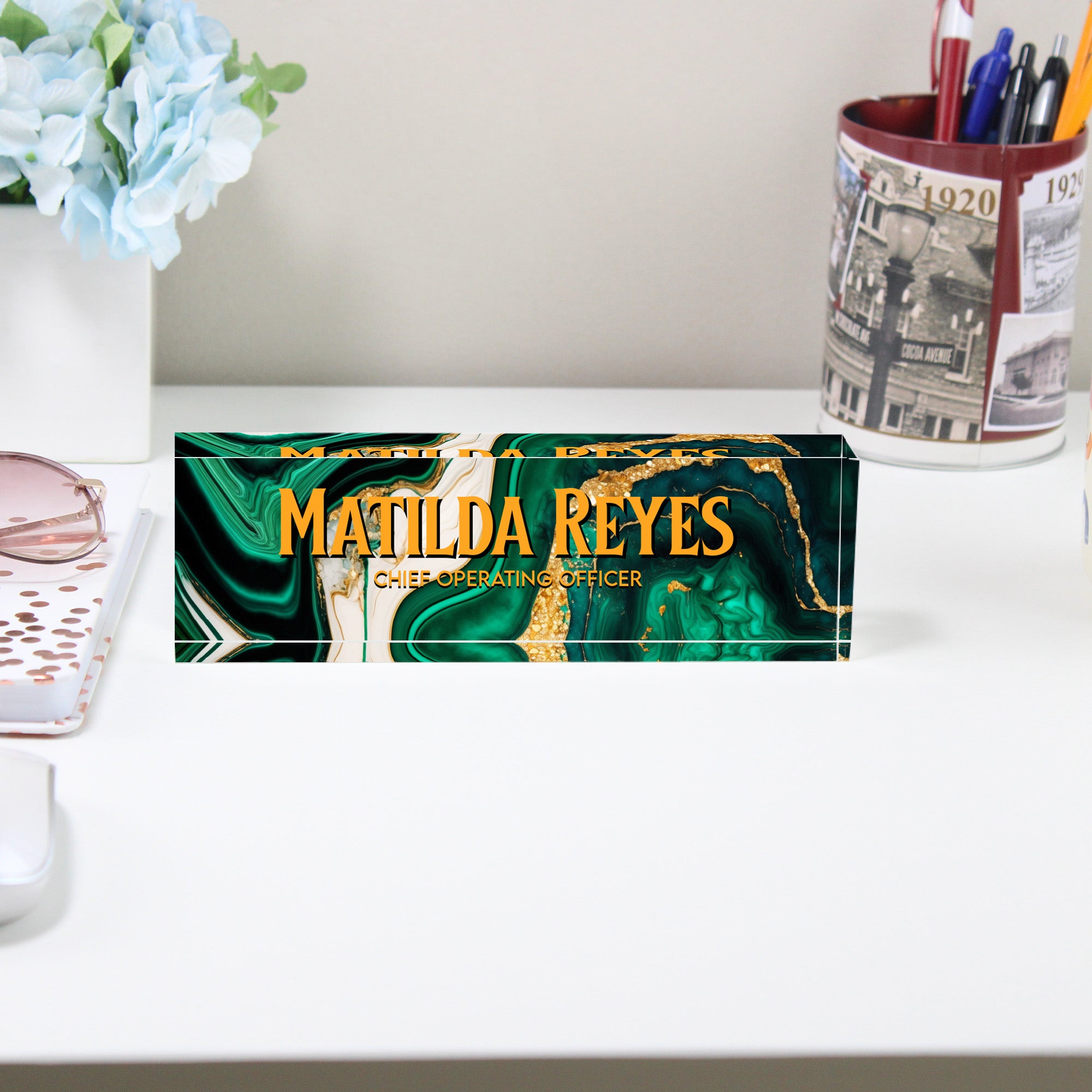 TAGS: personalized gift, desk accessory, nameplate, acrylic desk block, chief operating officer, executive gift, custom office decor, emerald marble, luxurious design, handmade, professional decor, office gift, unique gifts, coworker gift, custom engraving