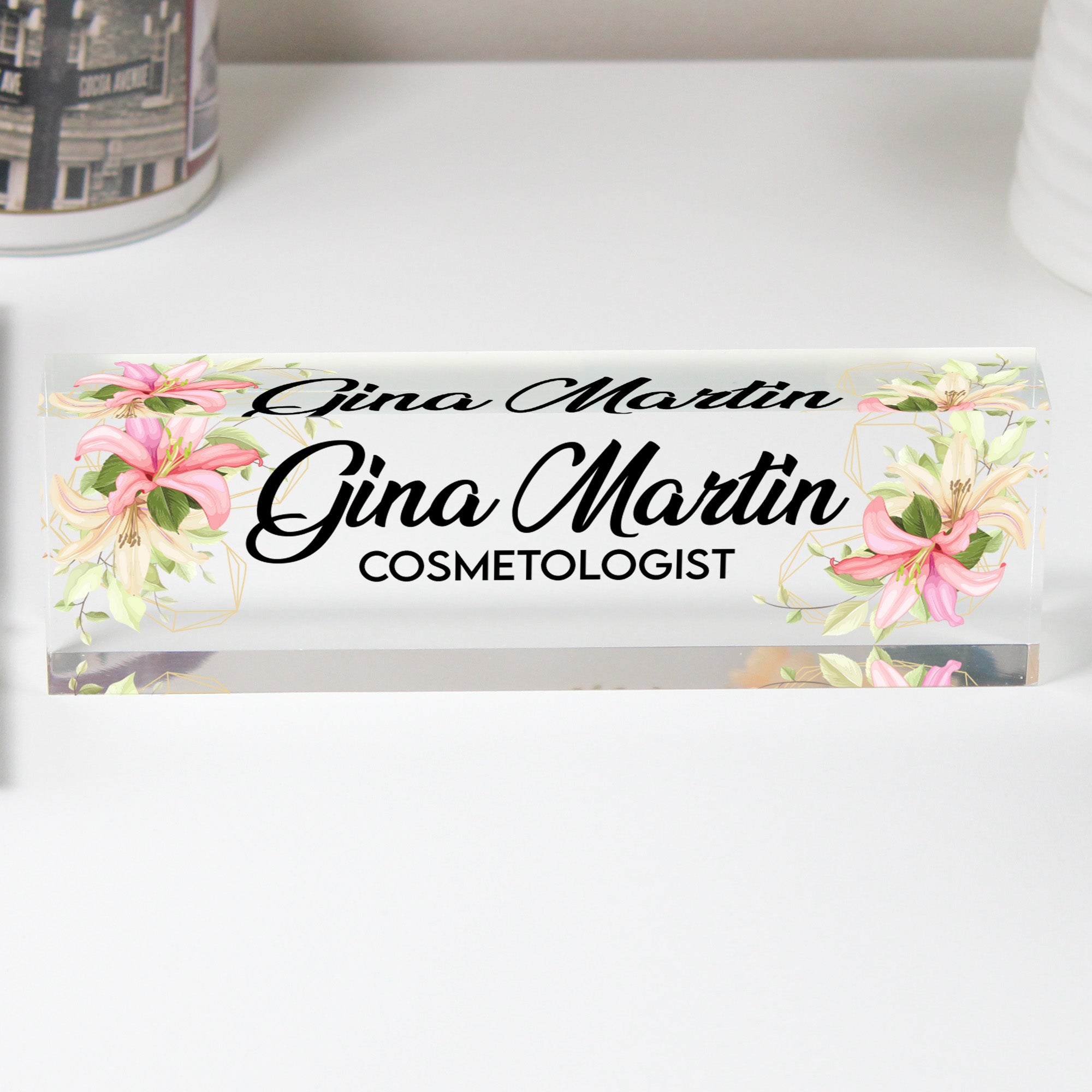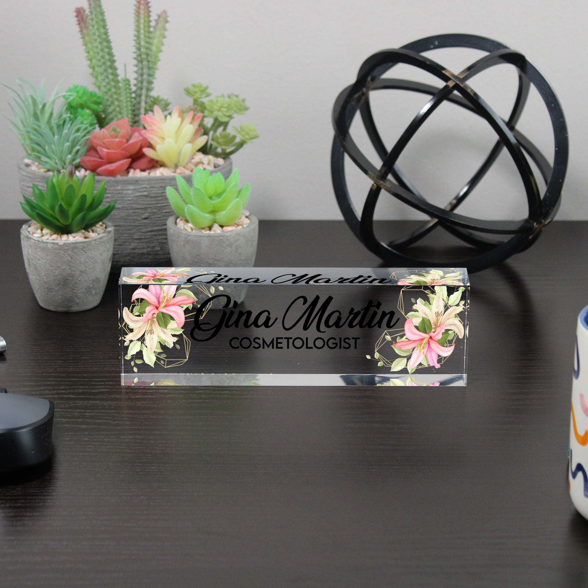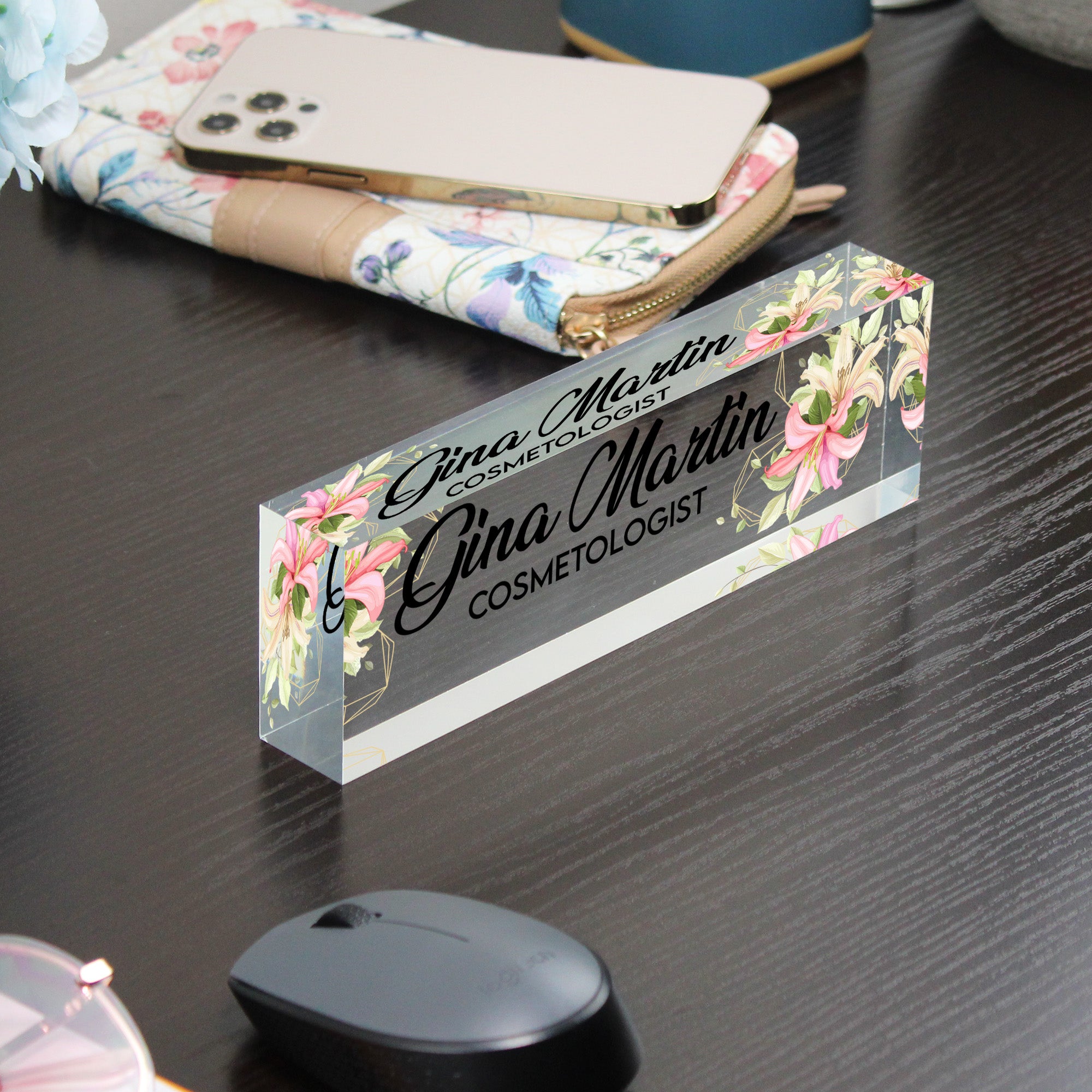 TAGS: personalized desk block, custom acrylic sign, cosmetologist gift, office decor, floral nameplate, beauty professional gift, graduation gift, personalized nameplate, handmade desk accessory, acrylic craft, custom gift, floral design, elegant desk decor, gift for her, name sign