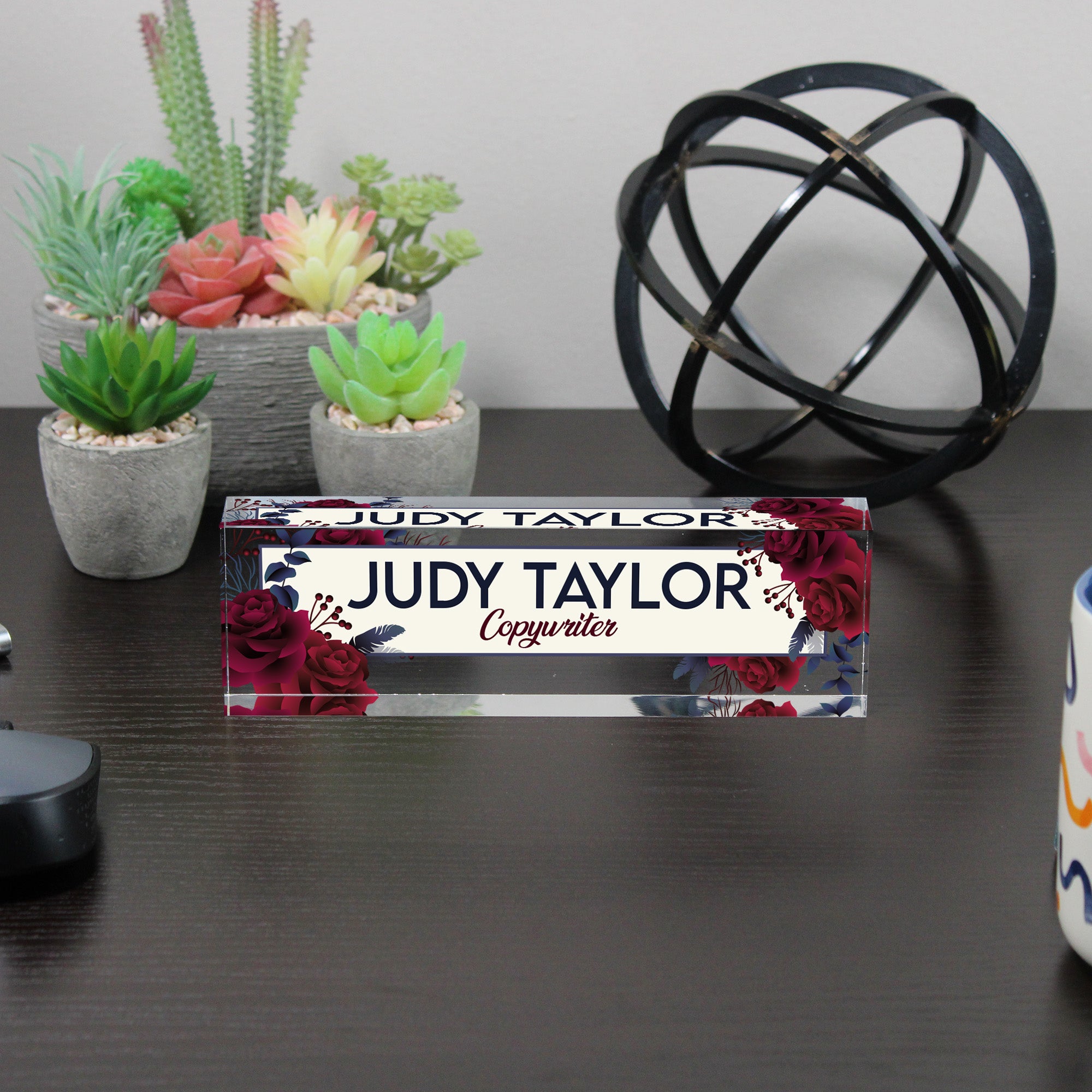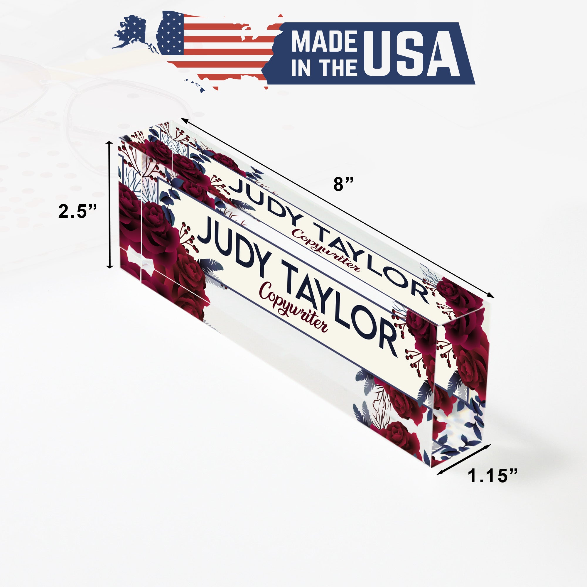 Elevate your workspace with our beautifully crafted personalized Acrylic Desk Block. This exquisite nameplate blends artistry and functionality, perfect for adding a personal touch to your office decor. Featuring a striking design of burgundy roses and delicate foliage, this desk block exudes sophistication and charm, making it an ideal gift for any occasion.