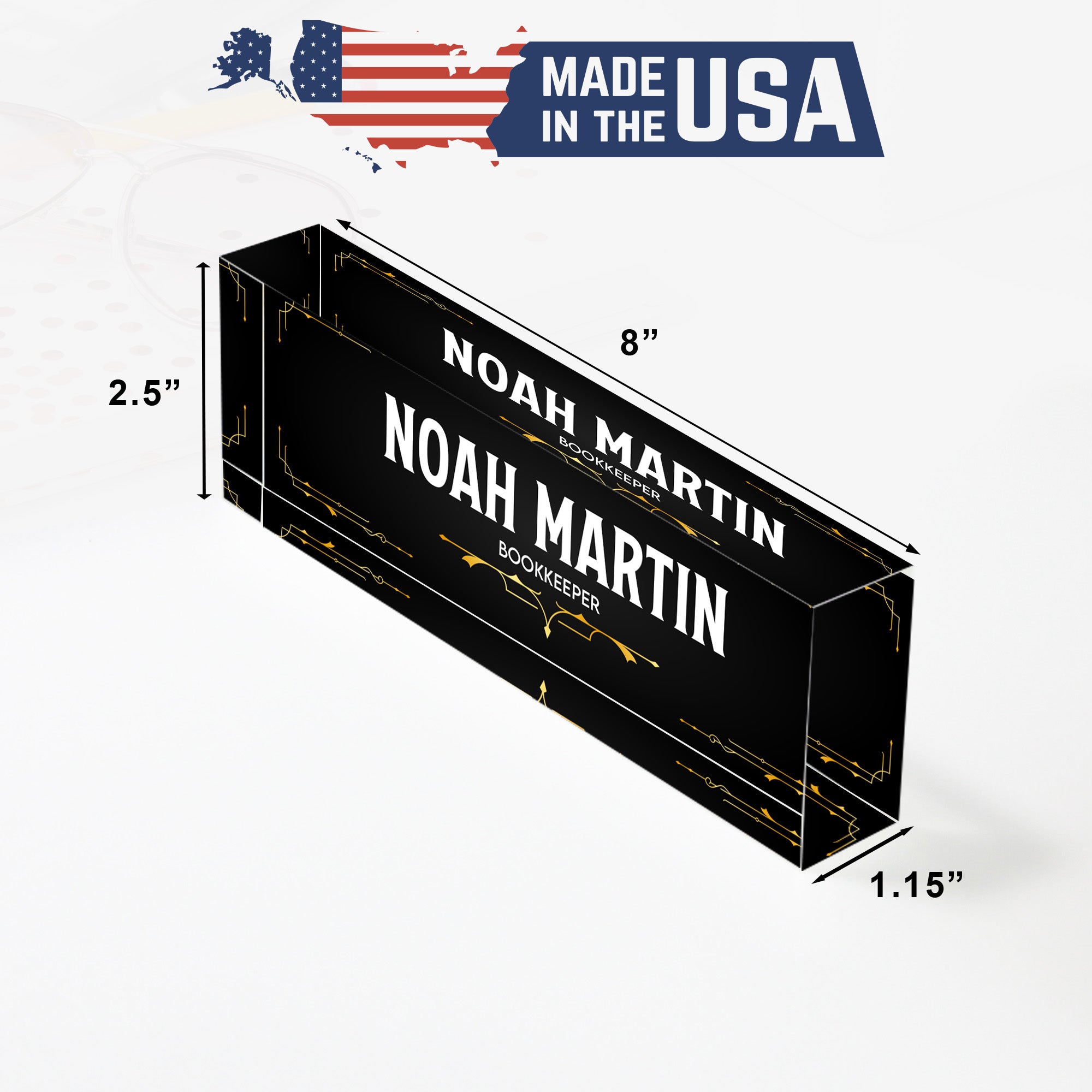 Enhance any workspace with this exquisite Personalized Acrylic Desk Name Plate, a unique gift for professionals and bookkeepers alike! Featuring a sophisticated Art Deco design, this desk accessory combines the classic elegance of black and gold with the durability of high-quality acrylic material.