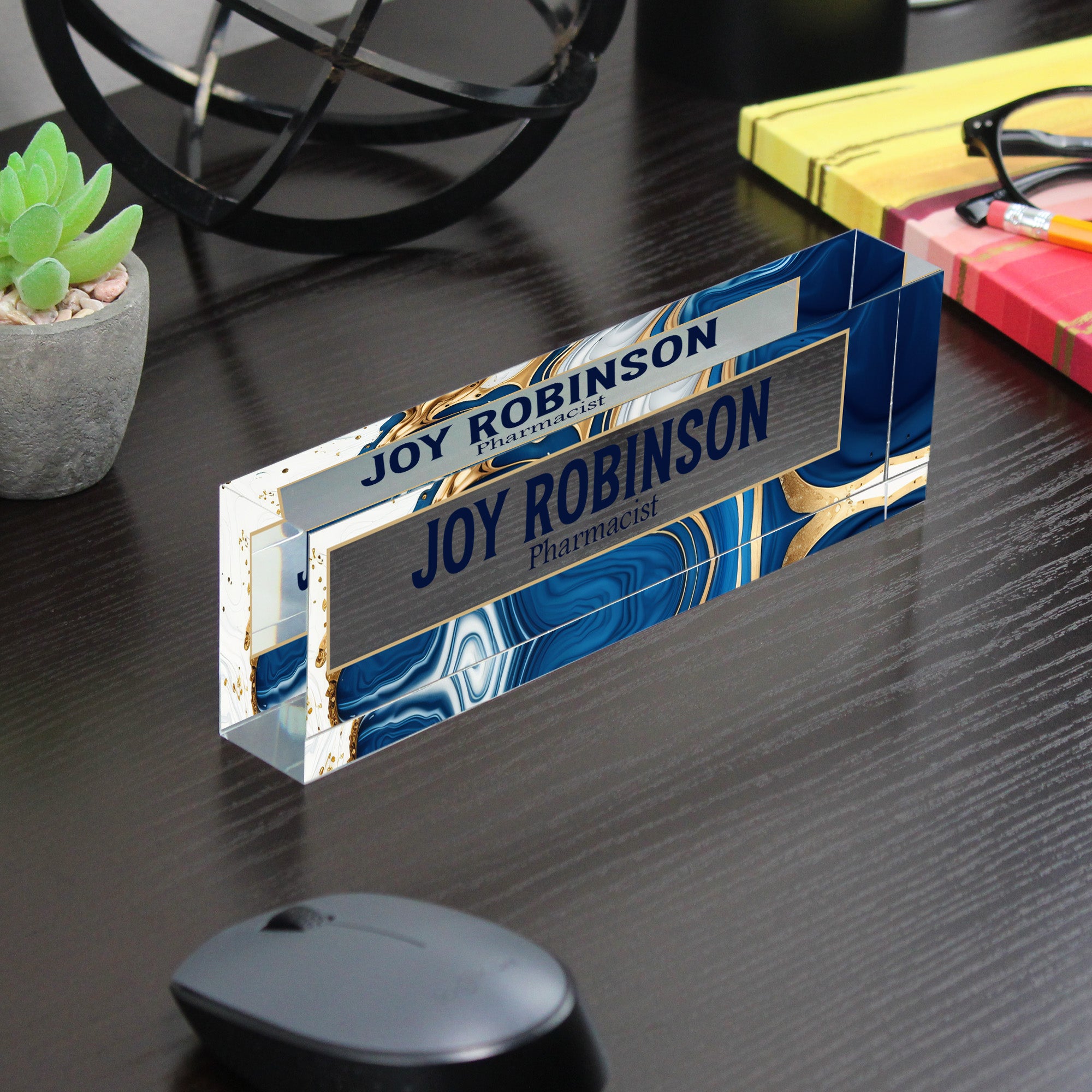 Elevate your workspace with this stunning Personalized Acrylic Desk Name Plate, featuring a unique marbled design in captivating shades of blue and gold. Skillfully crafted from premium quality acrylic, this desk block offers a sleek and stylish way to display your professional identity. The high-gloss finish enhances its durability and elegance, making it a standout piece for any office or home setting.