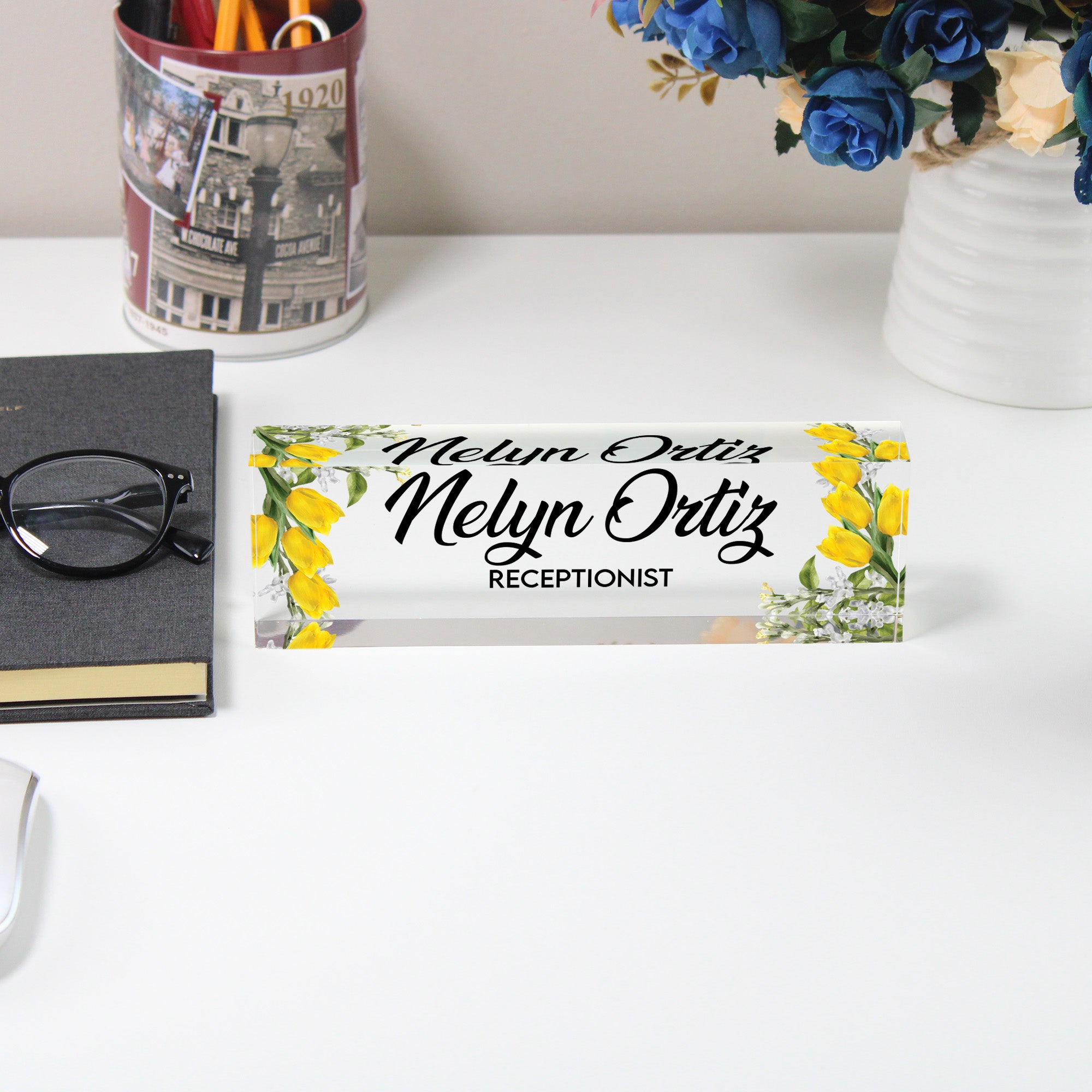 Elevate your workspace with our exquisite Personalized Acrylic Desk Name Plate, adorned with a delicate arrangement of yellow floral designs. This stunning desk block is an ideal blend of elegance and functionality, perfect for adding a personal touch to any office setting.