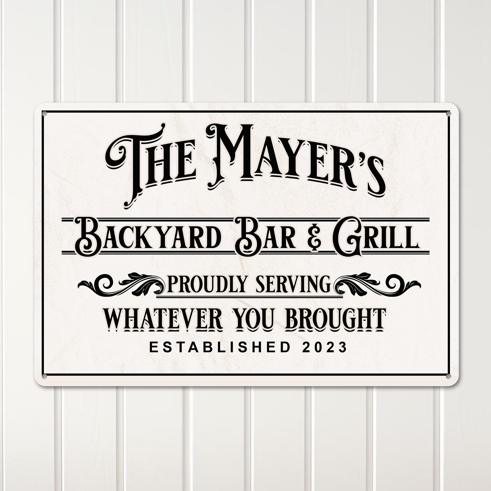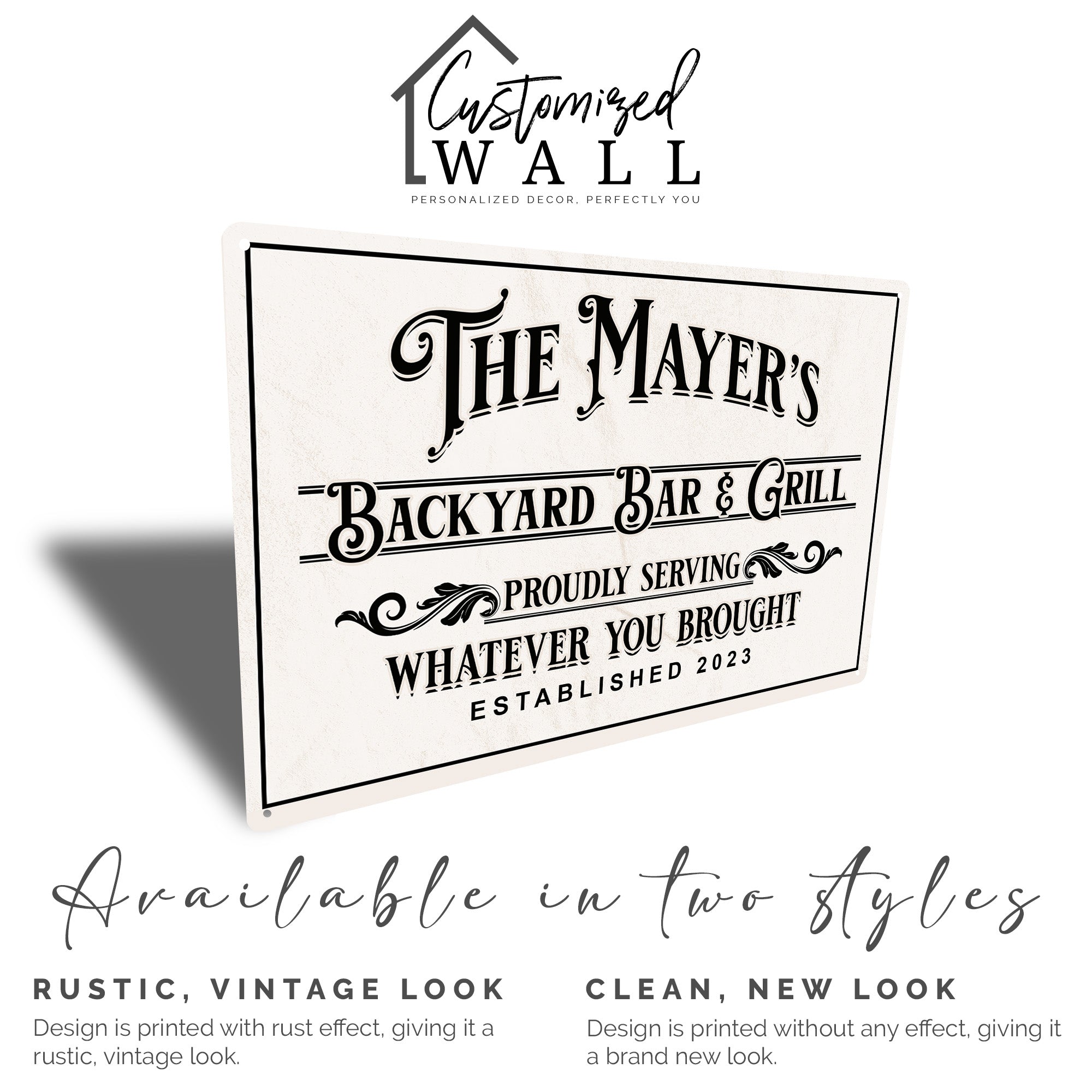 Enhance your outdoor space with a touch of humor and personalized charm with our "Backyard Bar & Grill" Metal Sign. Crafted from high-quality tin and featuring an elegant vintage design, this sign is a perfect accent for any patio, porch, or man cave.