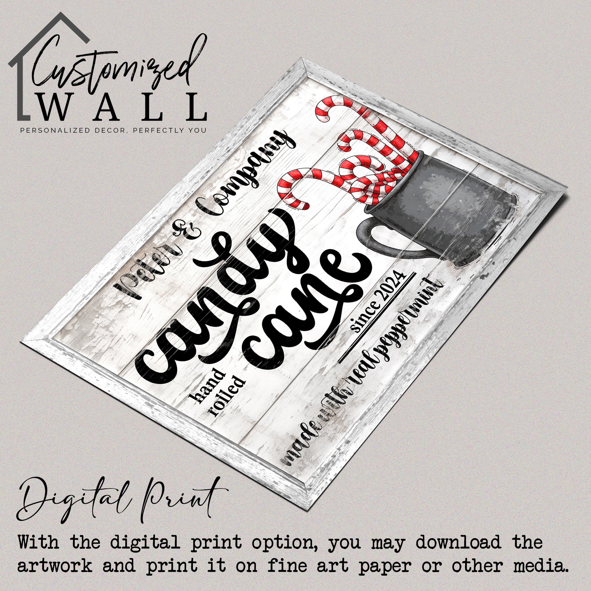 Elevate your holiday decor with our Personalized Candy Cane Wall Art on Wrapped Canvas, the perfect blend of festive charm and artisanal craftsmanship. Featuring a rustic whitewashed wood background, vibrant red and white candy canes, and a classic black mug illustration, this piece embodies the spirit of the season. The elegant script, "Peter & Company Candy Cane," adds a personal touch, making it an ideal gift for friends, family, or even yourself.