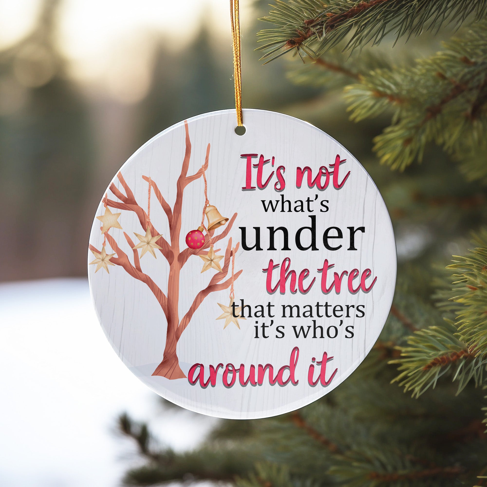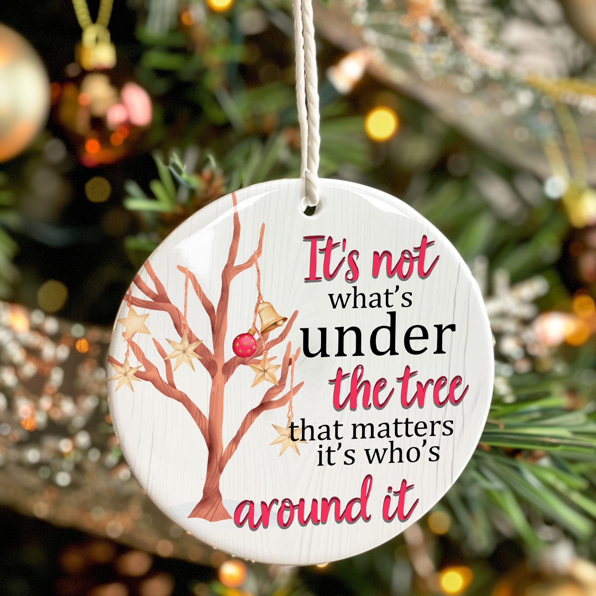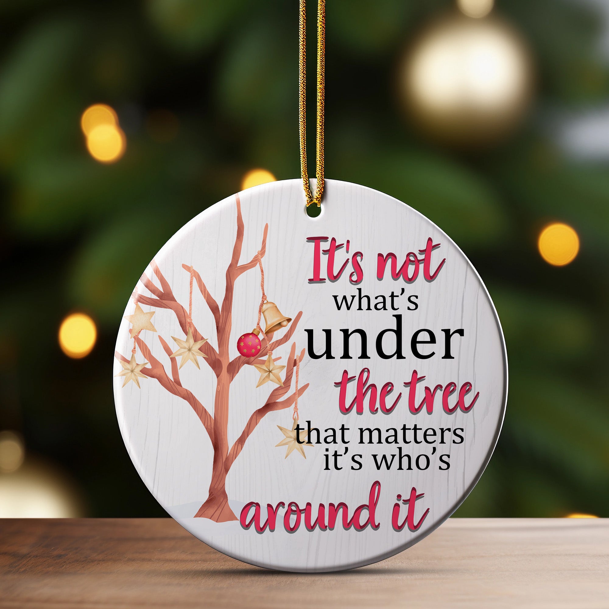 Experience the heartwarming magic of the holiday season with our Personalized Ceramic Christmas Ornament. This exquisite piece features a charming design showcasing a simple, elegant tree adorned with stars and bells, capturing the essence of festive joy. The thoughtful quote, "It's not what's under the tree that matters, it's who's around it," is a gentle reminder of what truly makes the holidays special.