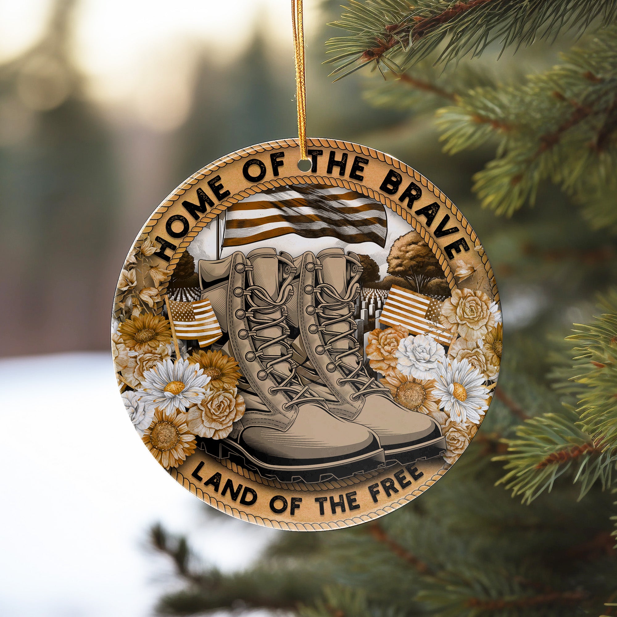 Honor the courage and sacrifice of our military heroes with this exquisite "Home of the Brave" Personalized Ceramic Ornament. Featuring a striking design of military boots surrounded by lush white and yellow flowers, each element is meticulously detailed to create a meaningful tribute to those who serve. The American flag waves proudly in the background, symbolizing freedom and patriotism.