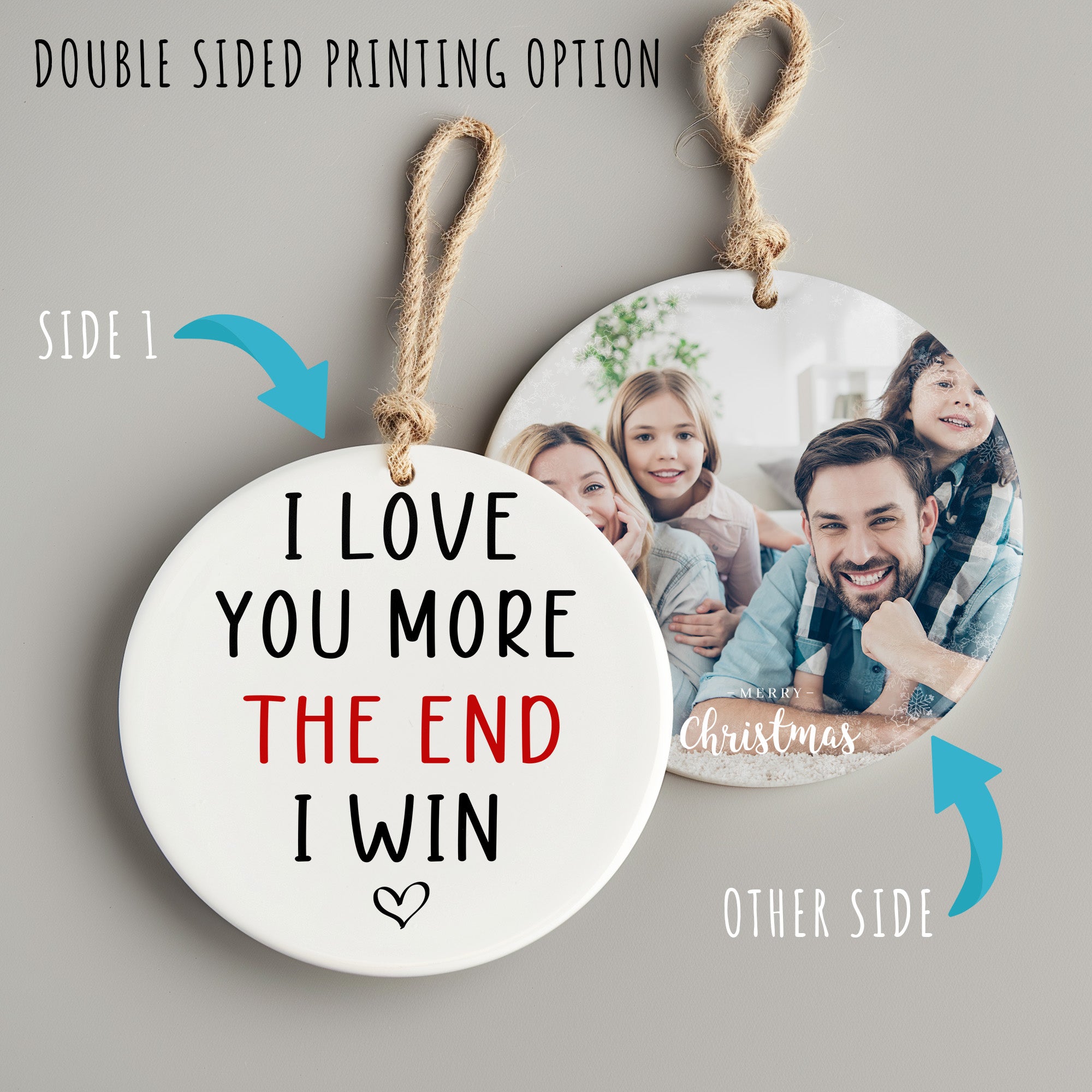 Bring a heartfelt touch to your celebrations with our Personalized Ceramic Ornament featuring the playful and loving message, "I Love You More, The End I Win." This beautifully crafted ornament is an ideal keepsake for expressing your affection to those you cherish.