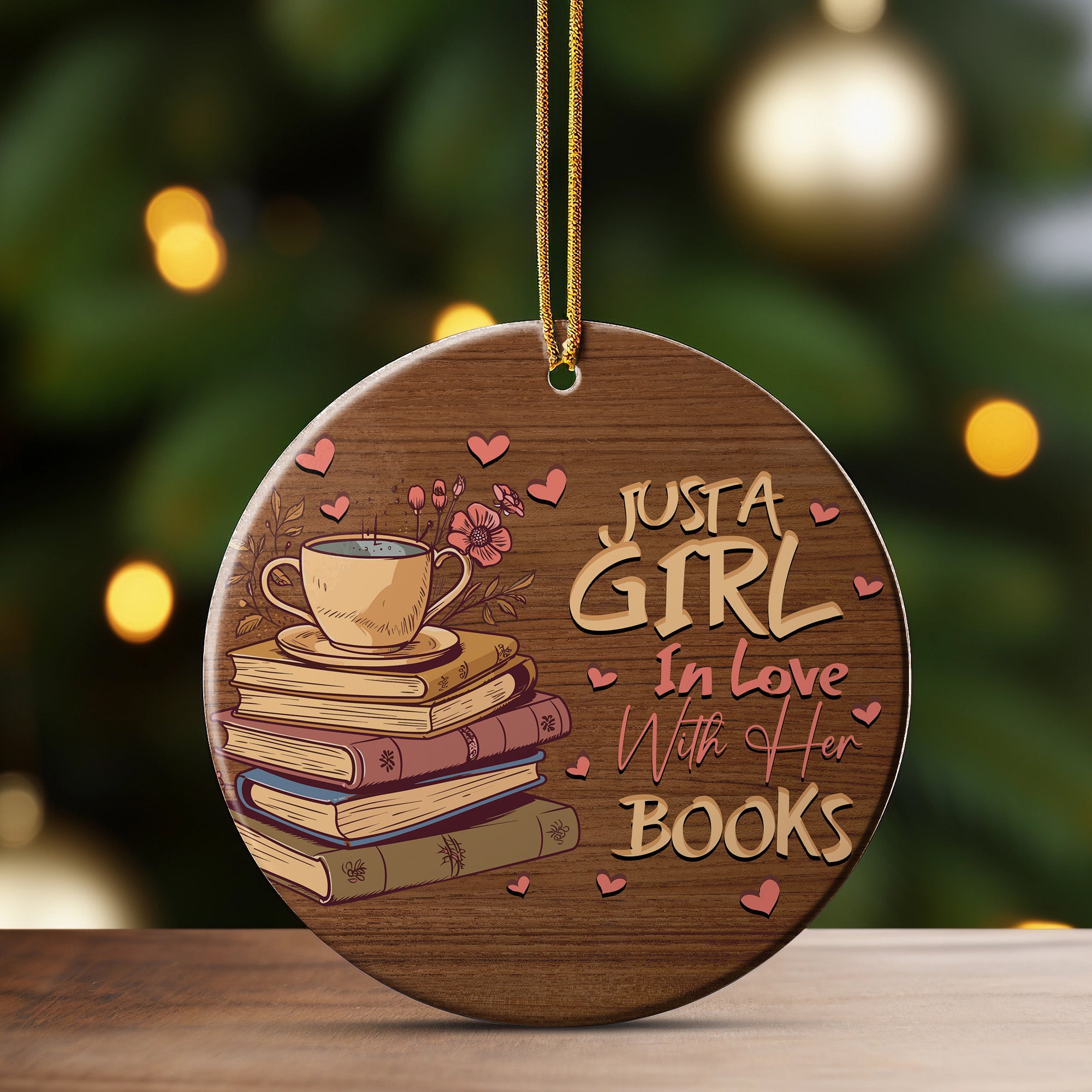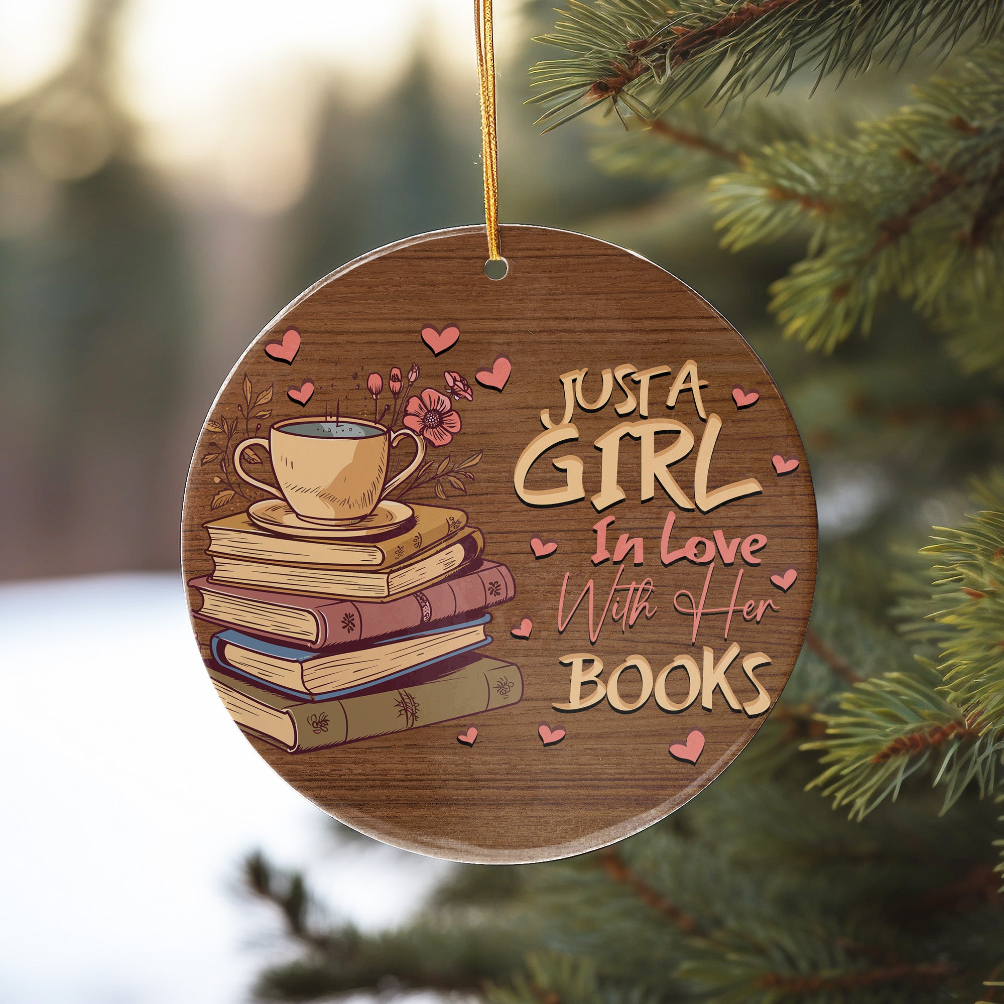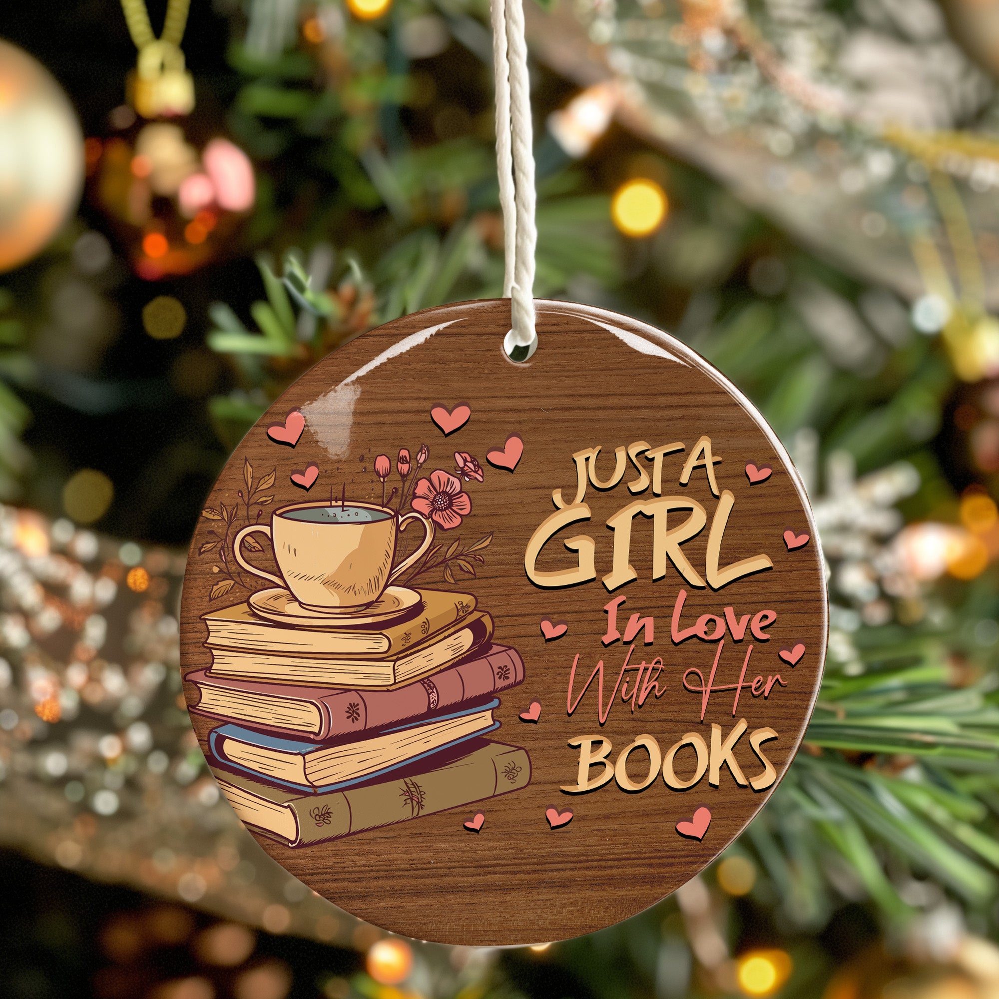 Elevate your gift-giving with this exquisite personalized ceramic ornament, perfect for book lovers everywhere. Crafted with keen attention to detail, this ornament captures the essence of a warm cup of tea and stacks of beloved books, surrounded by charming hearts and flowers. The heartwarming message, "Just a Girl in Love with Her Books," is elegantly inscribed in cheerful tones of pink and cream, accentuating the rustic woodgrain background.