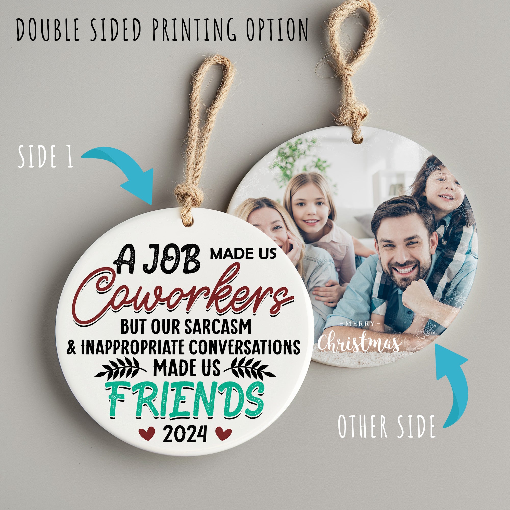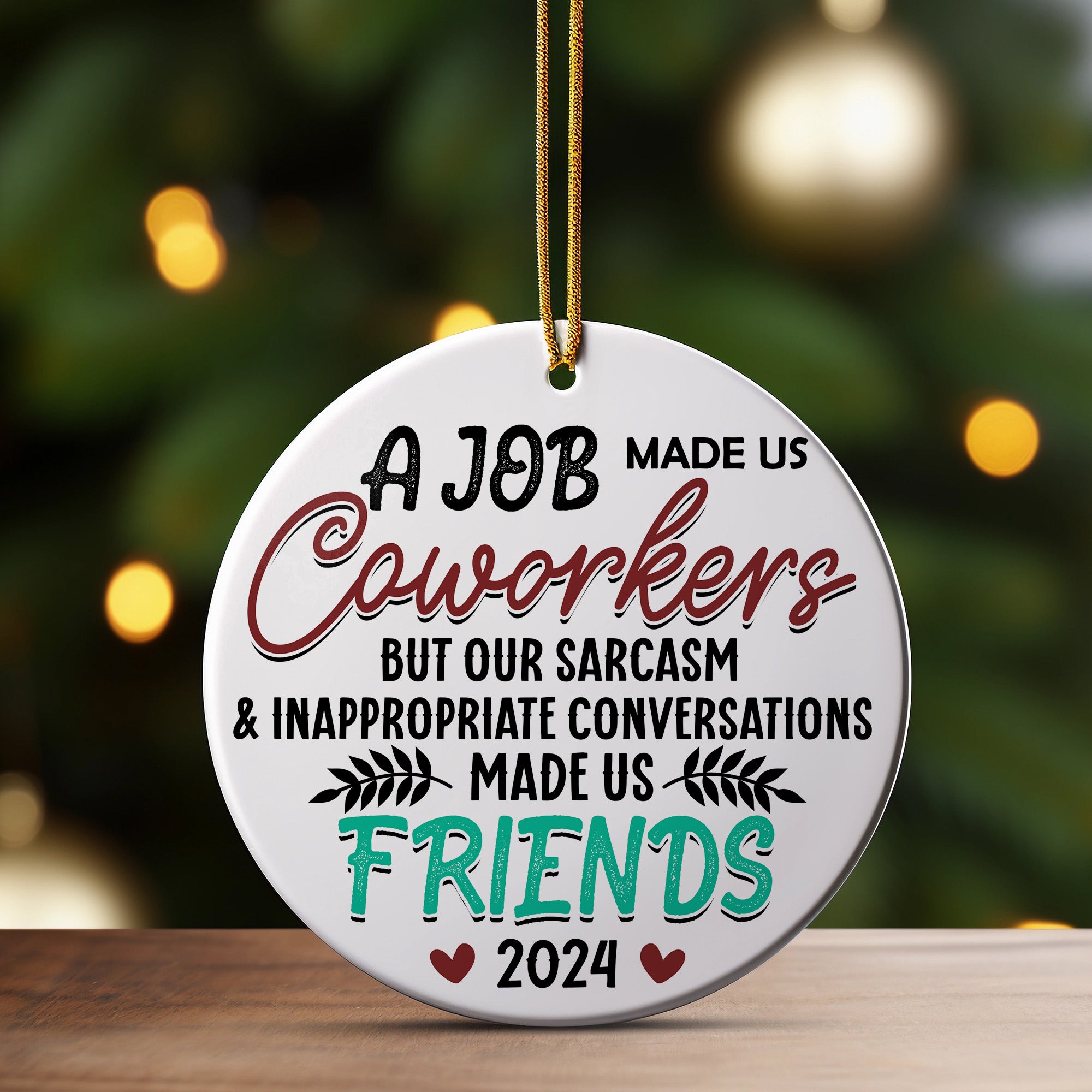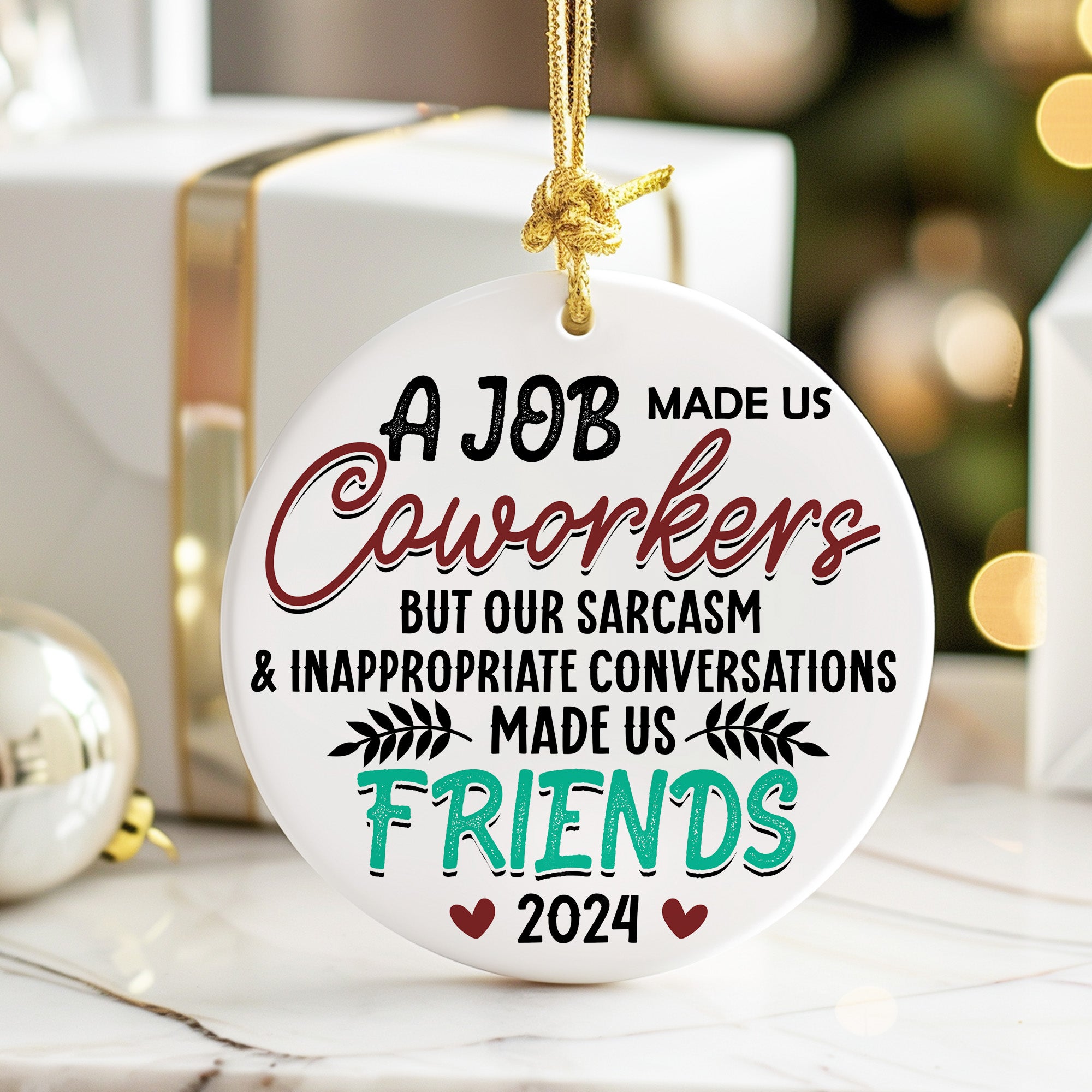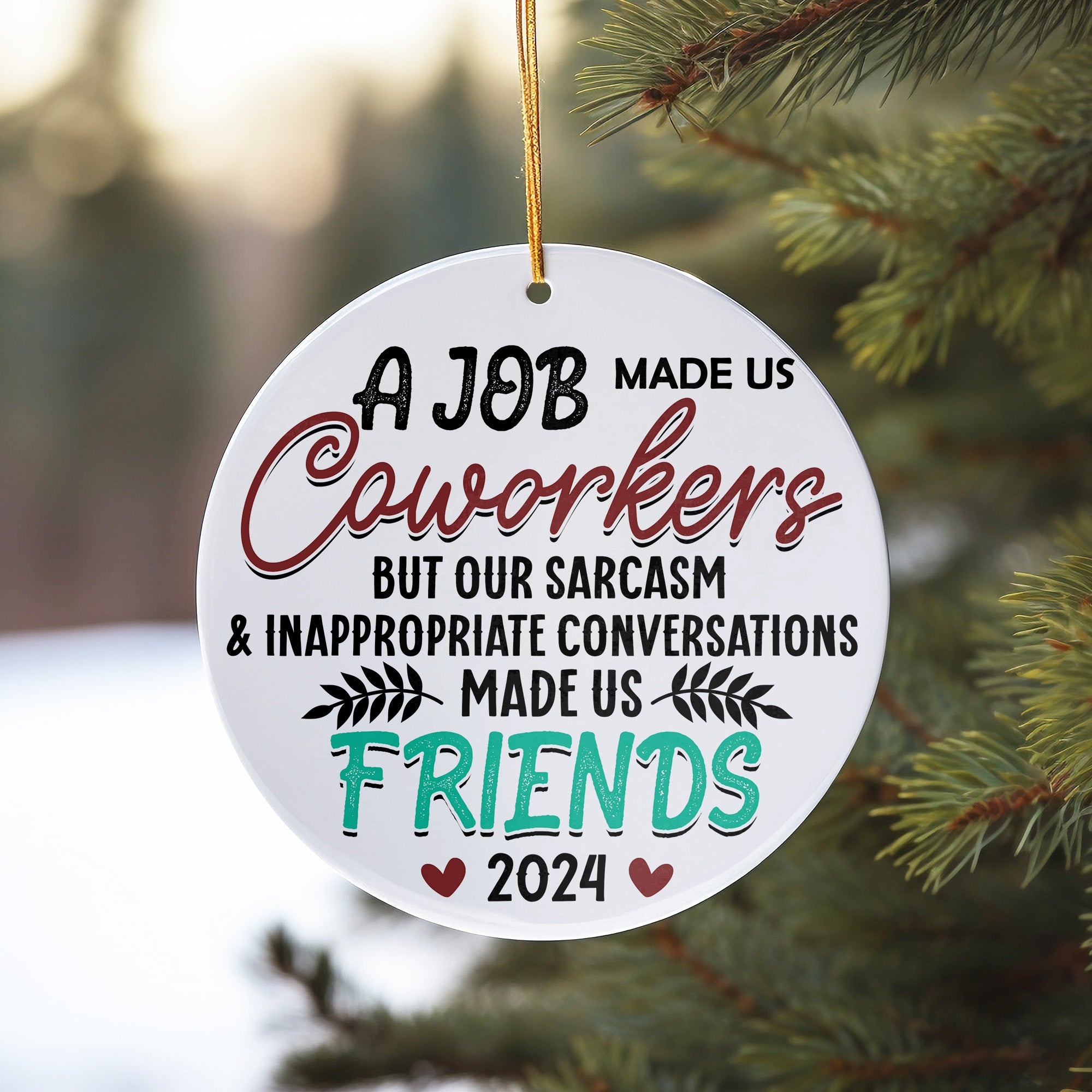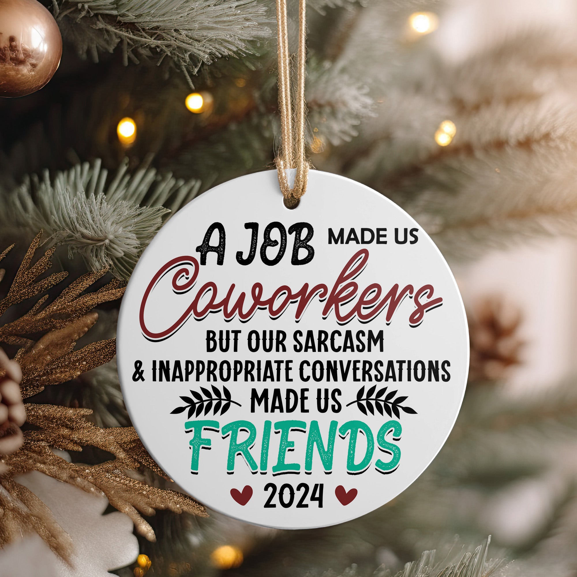 Elevate your holiday decor with our Personalized Ceramic Ornament, beautifully crafted to commemorate the special bond forged with your coworkers. This delightful ornament features an eye-catching design with a humorous message: "A JOB MADE US CoWORkErS BUT OUR SARCASM & INAPPROPRIATE CONVERSATIONS MADE US FRIENDS 2024." The playful typography in rich maroon, black, and teal colors adds a touch of whimsy, while the sleek, glossy finish brings a touch of elegance to your space.