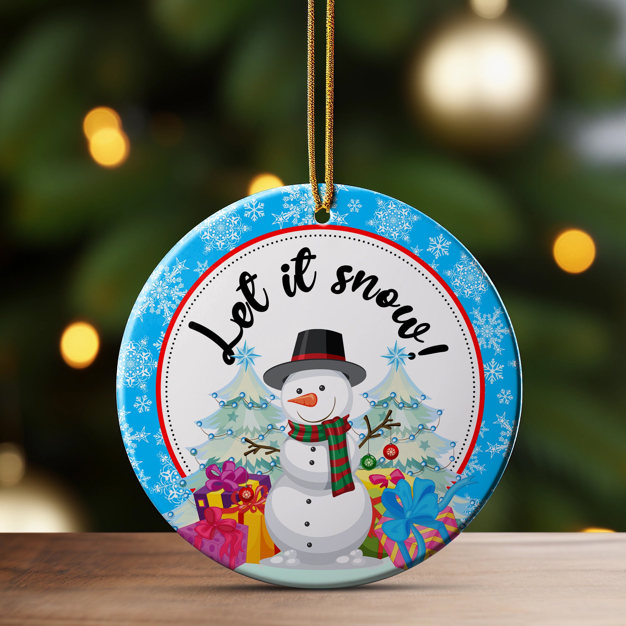 Transform your holiday decor with our charming Personalized Ceramic Snowman Ornament. Crafted with care, this delightful piece features a joyful snowman dressed in a classic black hat and striped scarf, surrounded by festive trees and colorful presents. The vibrant design is accented by a cheerful "Let it Snow" sentiment across the top, enhancing its festive appeal.