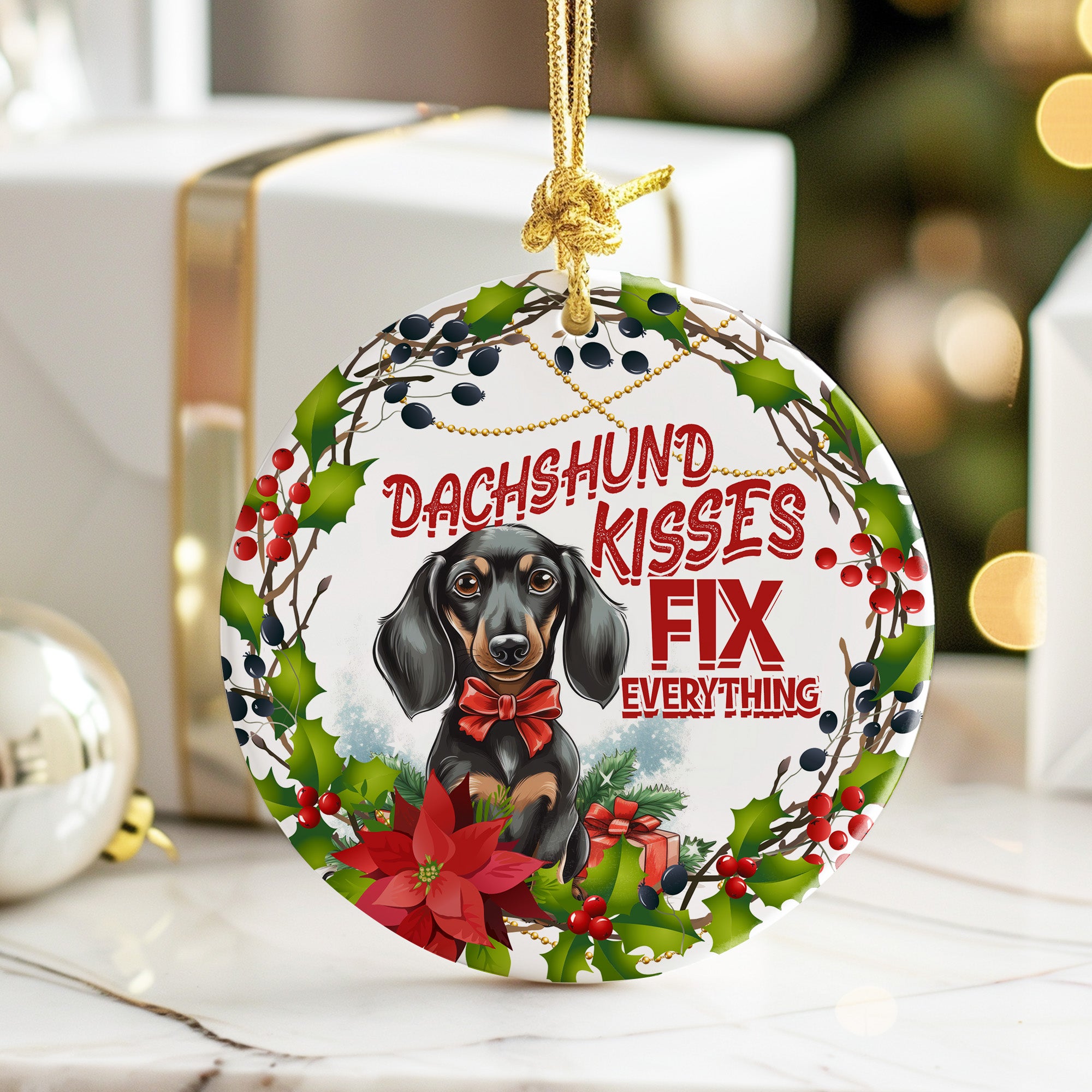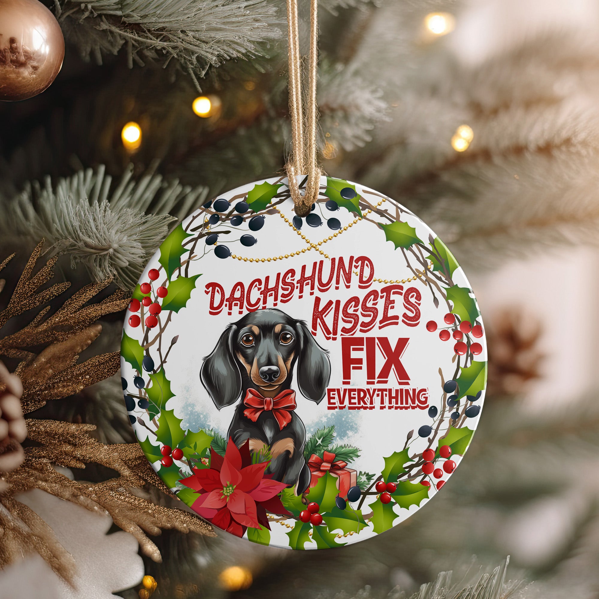 The bold text, "Dachshund Kisses Fix Everything," adds a touch of whimsy and joy to any space. The ornament's playful design and vivid colors make it a standout piece for your Christmas tree or as a seasonal display.