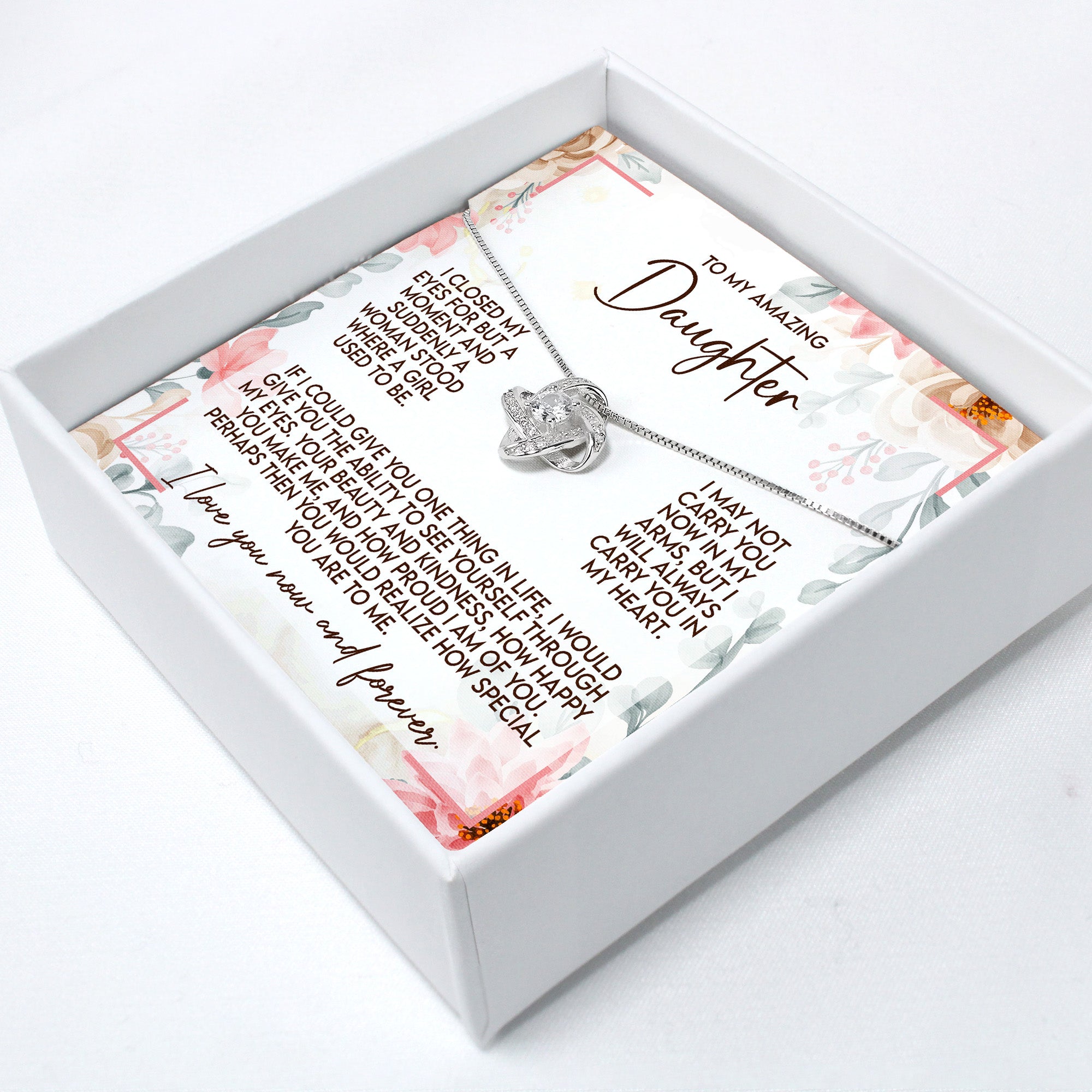 TAGS: personalized necklace, daughter gift, sterling silver, heartfelt gift, message card, emotional connection, knot design, birthday gift, graduation gift, special occasions, custom jewelry, handmade jewelry, meaningful gift, keepsake, sentimental gift