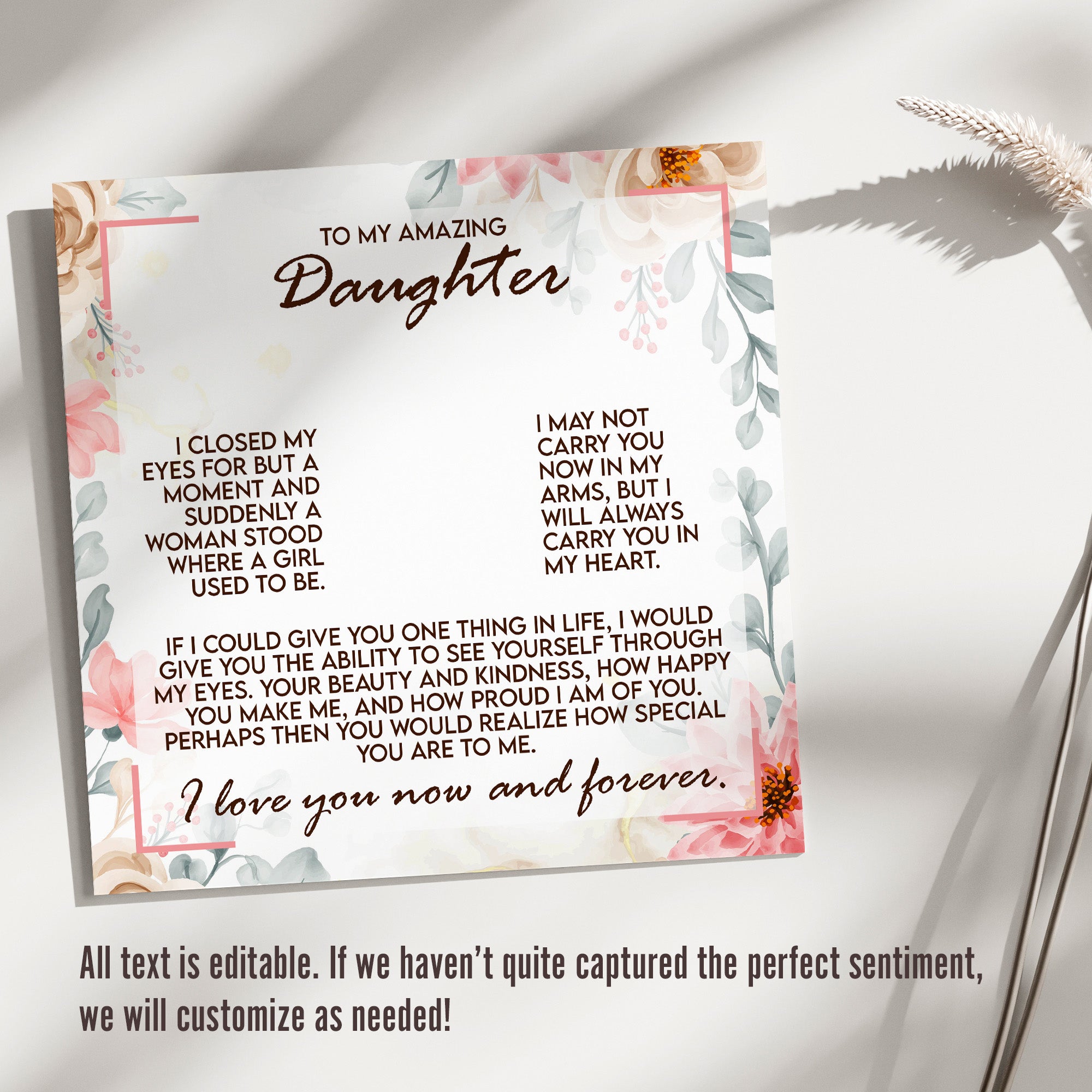 The accompanying message card is adorned with a floral pattern, featuring soft pastel colors that add a touch of elegance and warmth. The heartfelt message reflects your pride and love, promising to carry her in your heart always. This combination of words and design elements creates an emotional connection that will resonate deeply with your daughter.