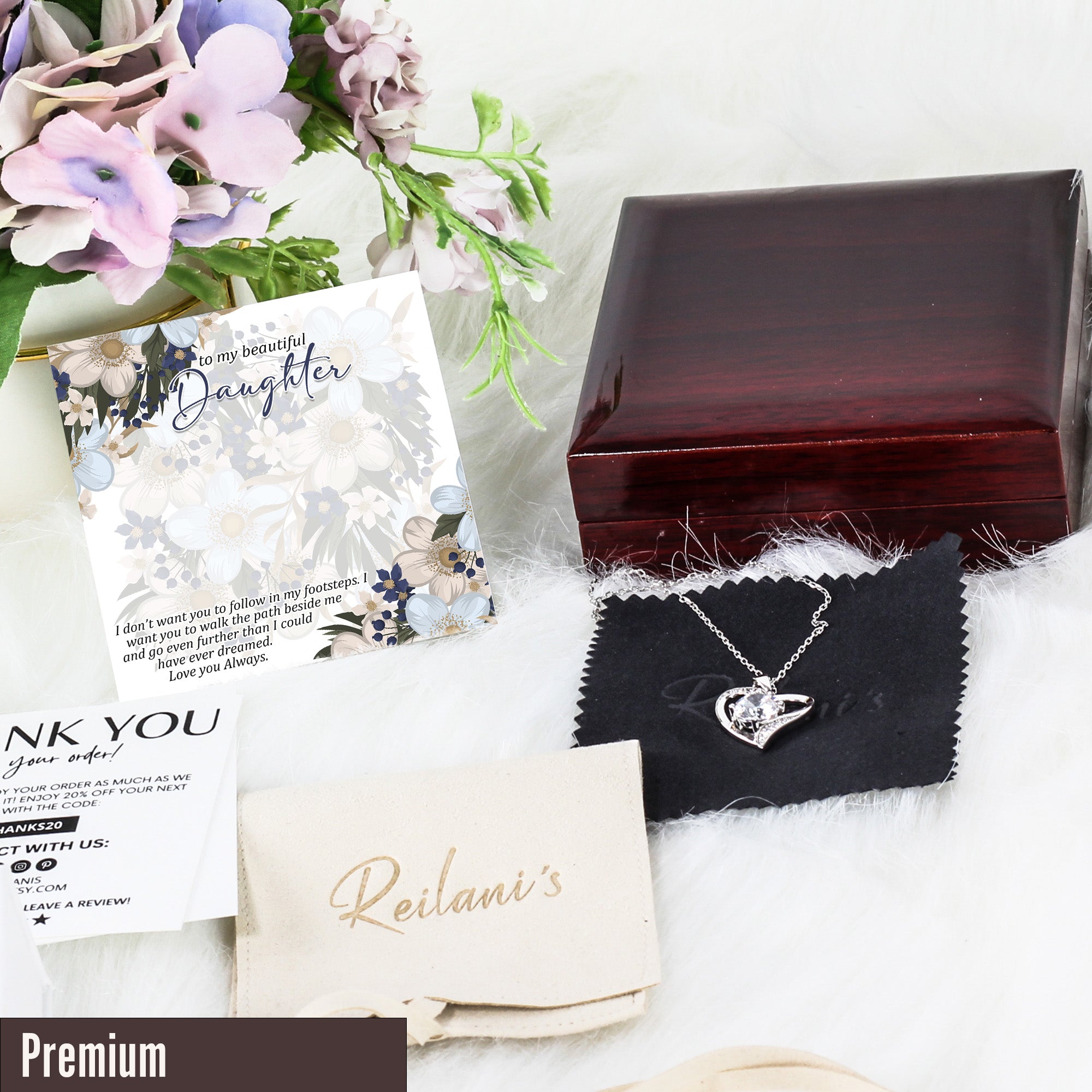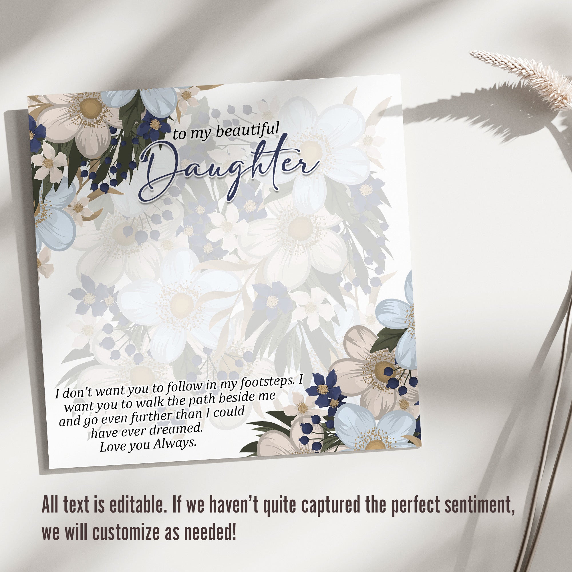 The necklace is beautifully displayed on a message card, adorned with delicate floral patterns in soothing shades of blue, cream, and green. The card bears an inspirational message: "I don’t want you to follow in my footsteps. I want you to walk the path beside me and go even further than I could have ever dreamed. Love you Always." This heartfelt sentiment is designed to inspire and uplift, making it the perfect gift for birthdays, graduations, or just because.