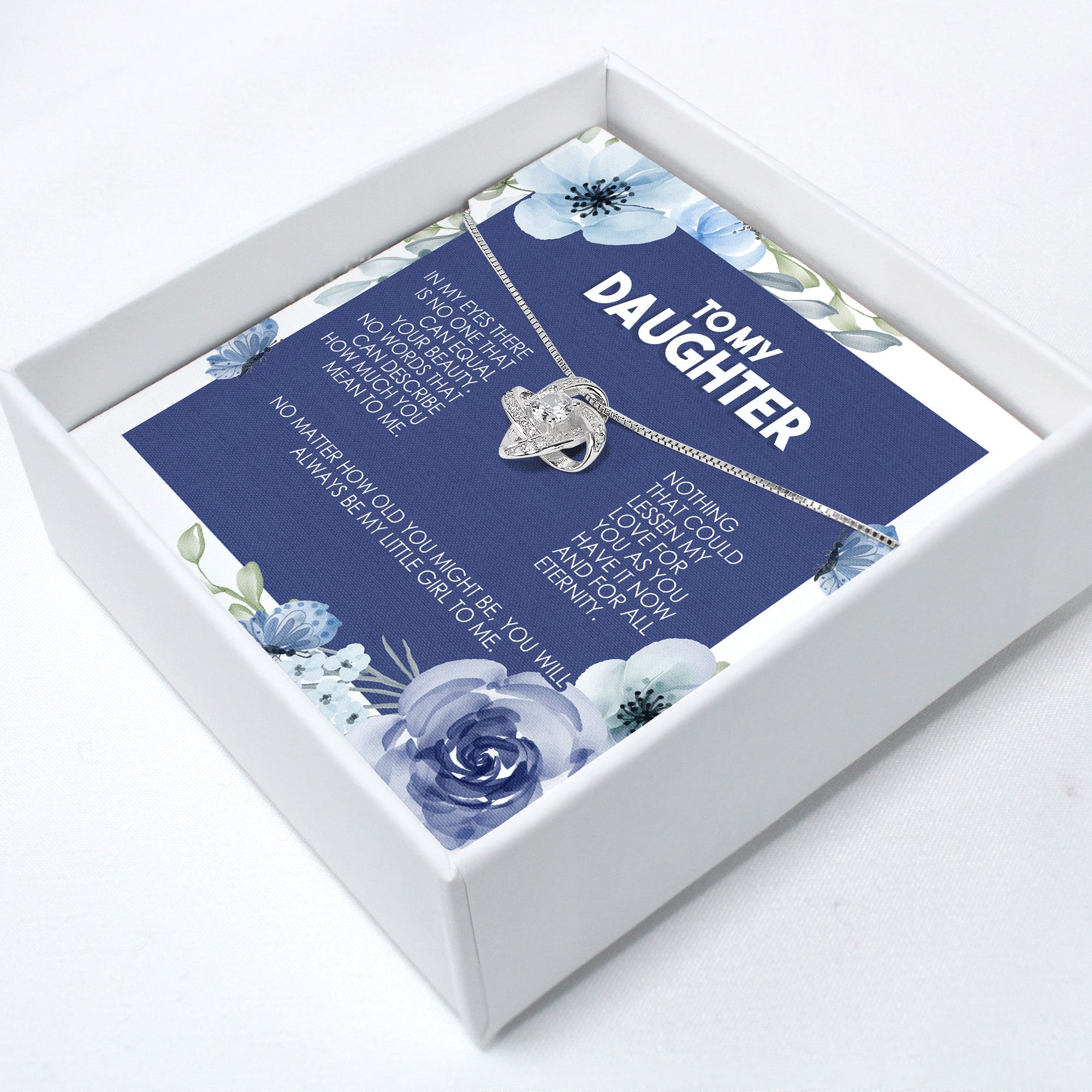 Celebrate the unbreakable bond with your daughter with this exquisite Personalized Daughter Necklace. Featuring a beautifully crafted infinity knot pendant adorned with sparkling cubic zirconia, this sterling silver necklace is not only a piece of jewelry but a timeless sentiment of love.