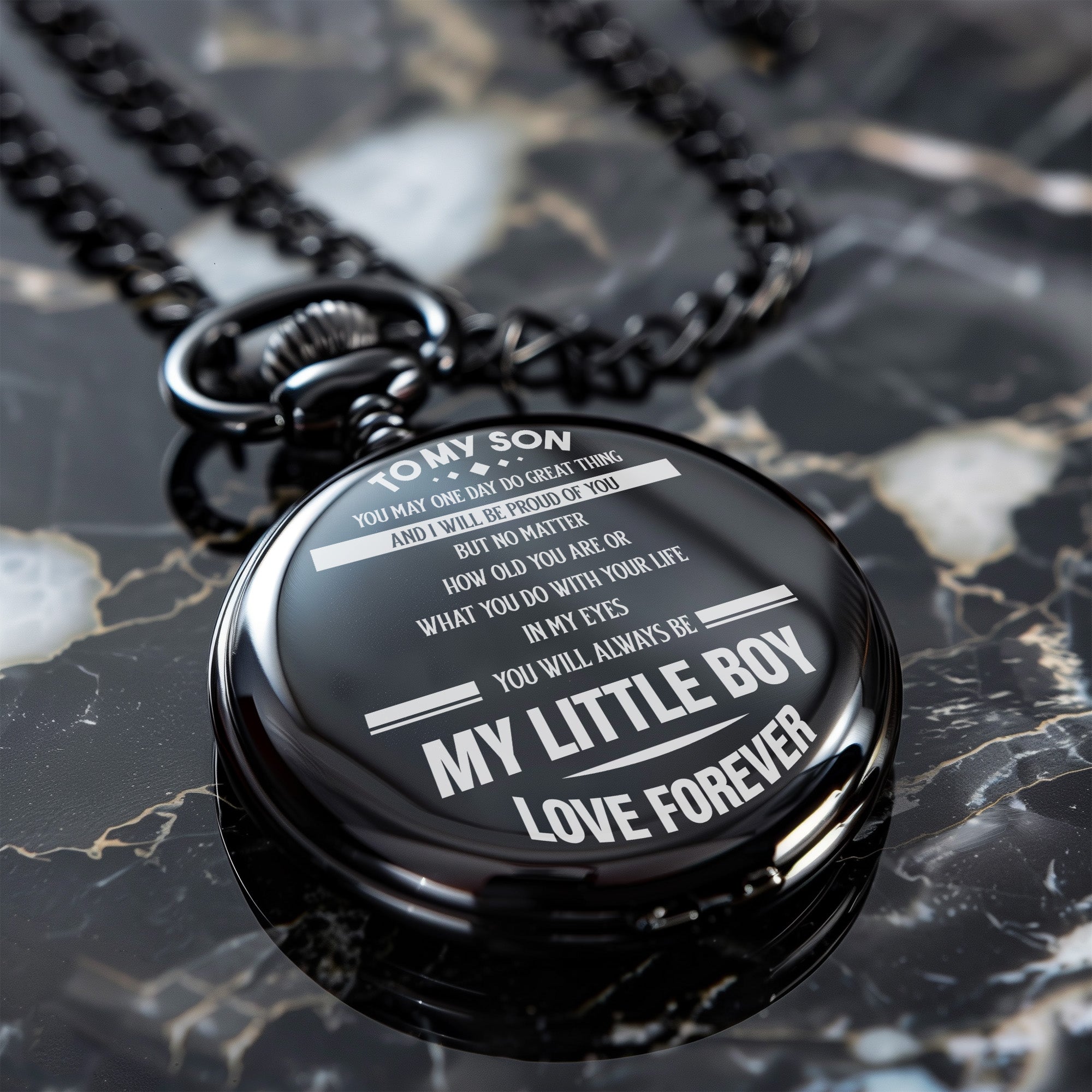 Discover the perfect gift that captures timeless love and pride with our Personalized Engraved Pocket Watch for Sons. Crafted with meticulous attention to detail, this stunning black pocket watch features an elegant design and heartfelt message that reads: "To My Son. You may one day do great things and I will be proud of you, but no matter how old you are or what you do with your life, in my eyes you will always be my little boy. Love forever."