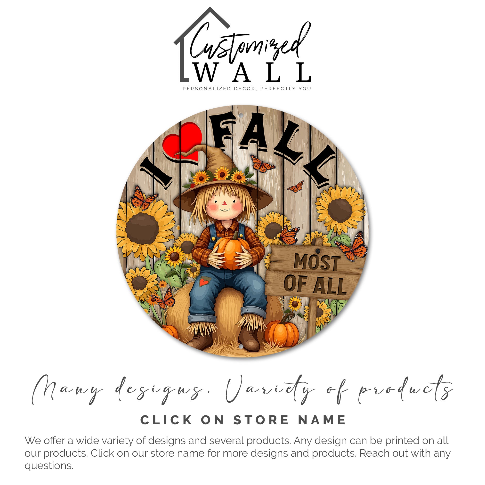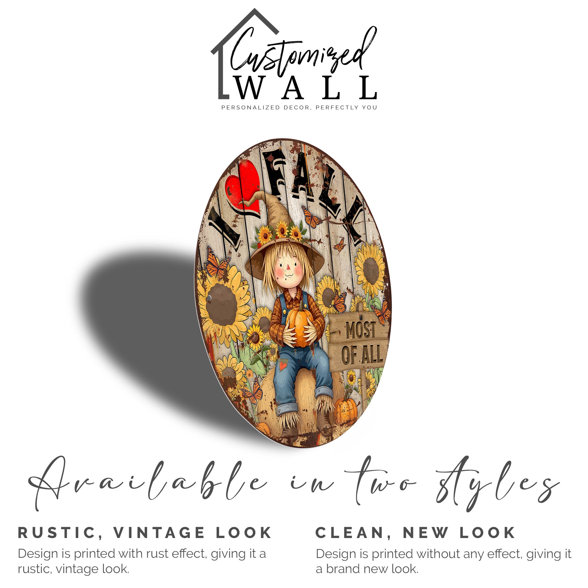 Embrace the warmth of autumn with our Personalized Fall Harvest Metal Sign! Featuring a delightful scarecrow surrounded by vibrant sunflowers, pumpkins, and fluttering butterflies, this round metal sign brings joyful seasonal ambiance to any space. The text "I ♥ FALL MOST OF ALL" perfectly captures the sentiment of fall enthusiasts everywhere.