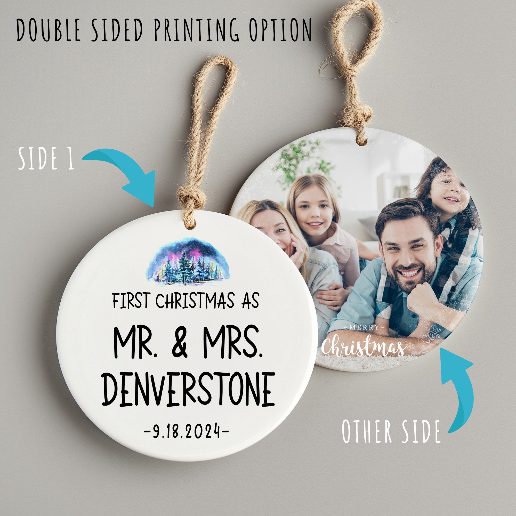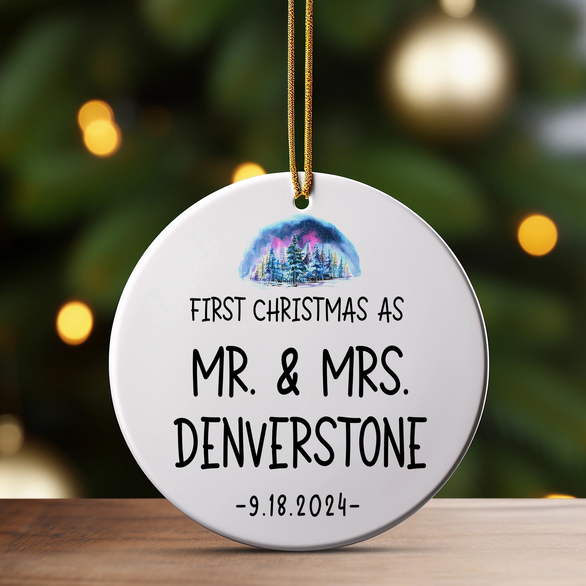 Our ornament is adorned with elegant black text that reads "First Christmas as Mr. & Mrs. Denverstone," complemented by the customizable date "9.18.2024." Personalize it with your unique details to commemorate your special day. The gold thread hanger adds a touch of sophistication, ready to grace your Christmas tree or display anywhere in your home.