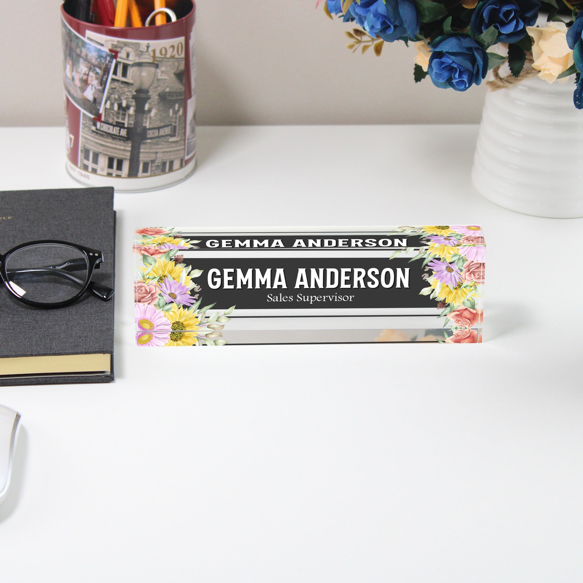 The desk block features a striking contrast between the deep black background and the vivid floral pattern, accentuated by elegant typography. Personalize it with any name and title to create a unique item tailored just for you or a special someone.
