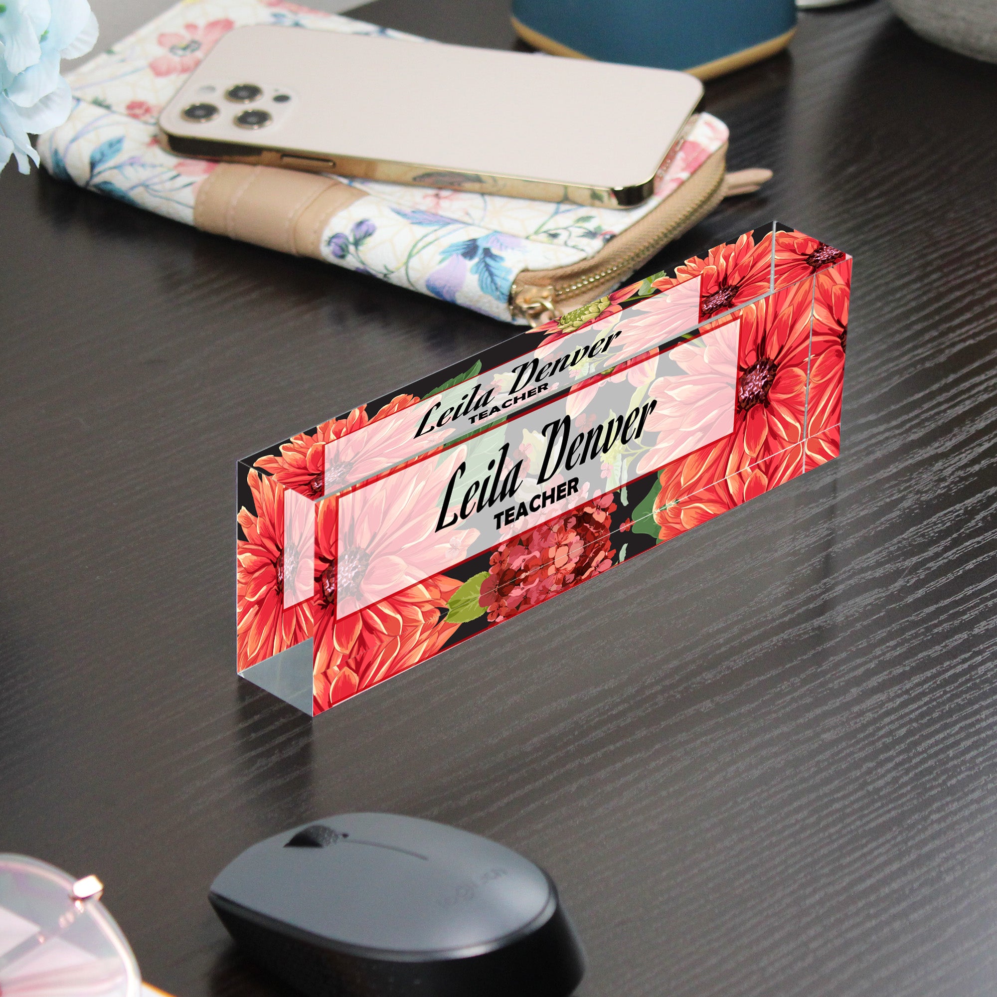 TAGS: personalized name block, floral desk accessory, acrylic desk name, custom teacher gift, elegant office decor, personalized teacher nameplate, mothers day gift, teacher appreciation, floral pattern decor, gift for coworker, custom office gift, bespoke desk accessory, personalized gift for her, floral acrylic block, customized desk name znak
