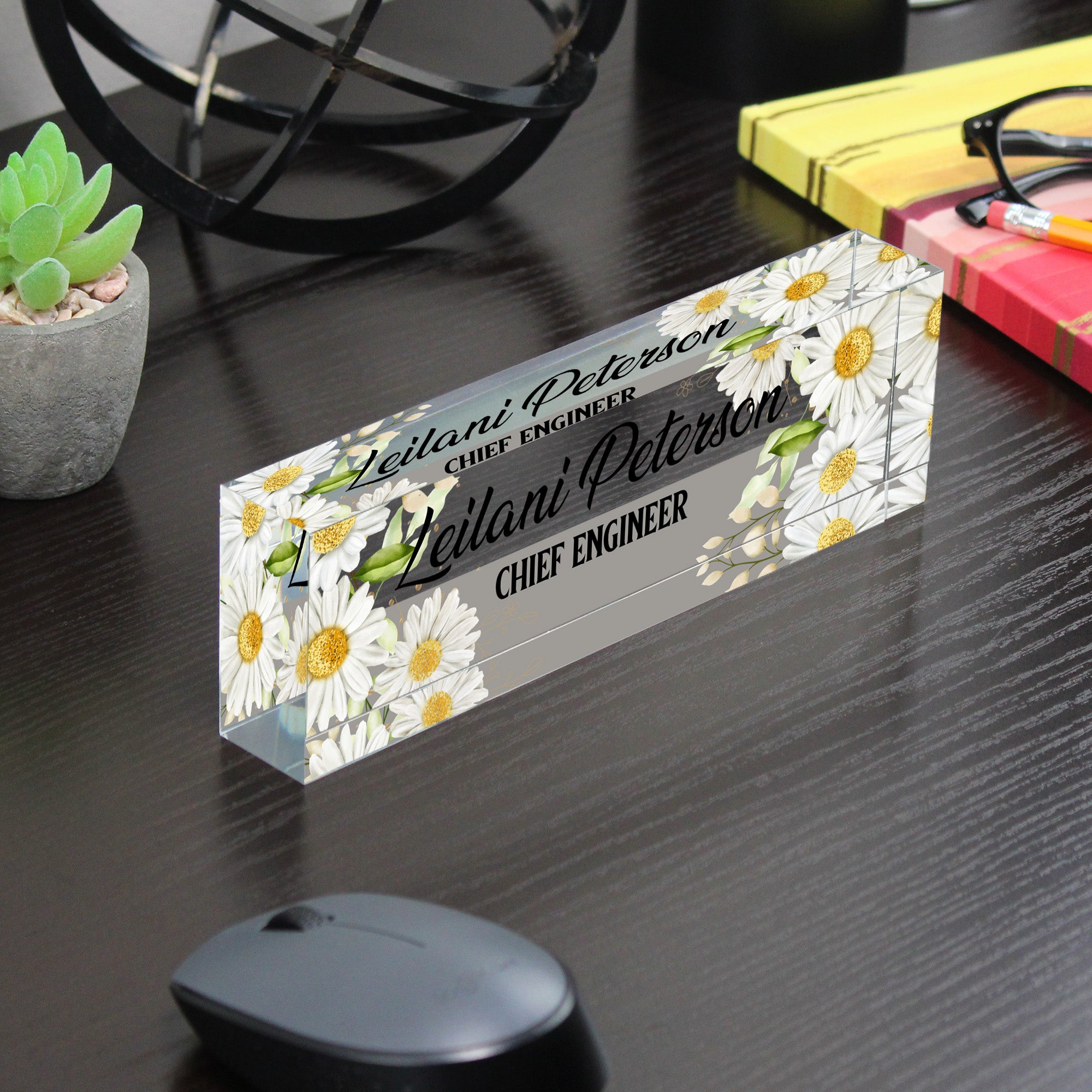 TAGS: personalized name plate, acrylic desk block, floral design, custom office decor, gift for her, gift for boss, custom nameplate, office accessories, personalized gifts, desk name sign, handmade desk decor, chief engineer gifts, daisy pattern, unique office gift, professional decor