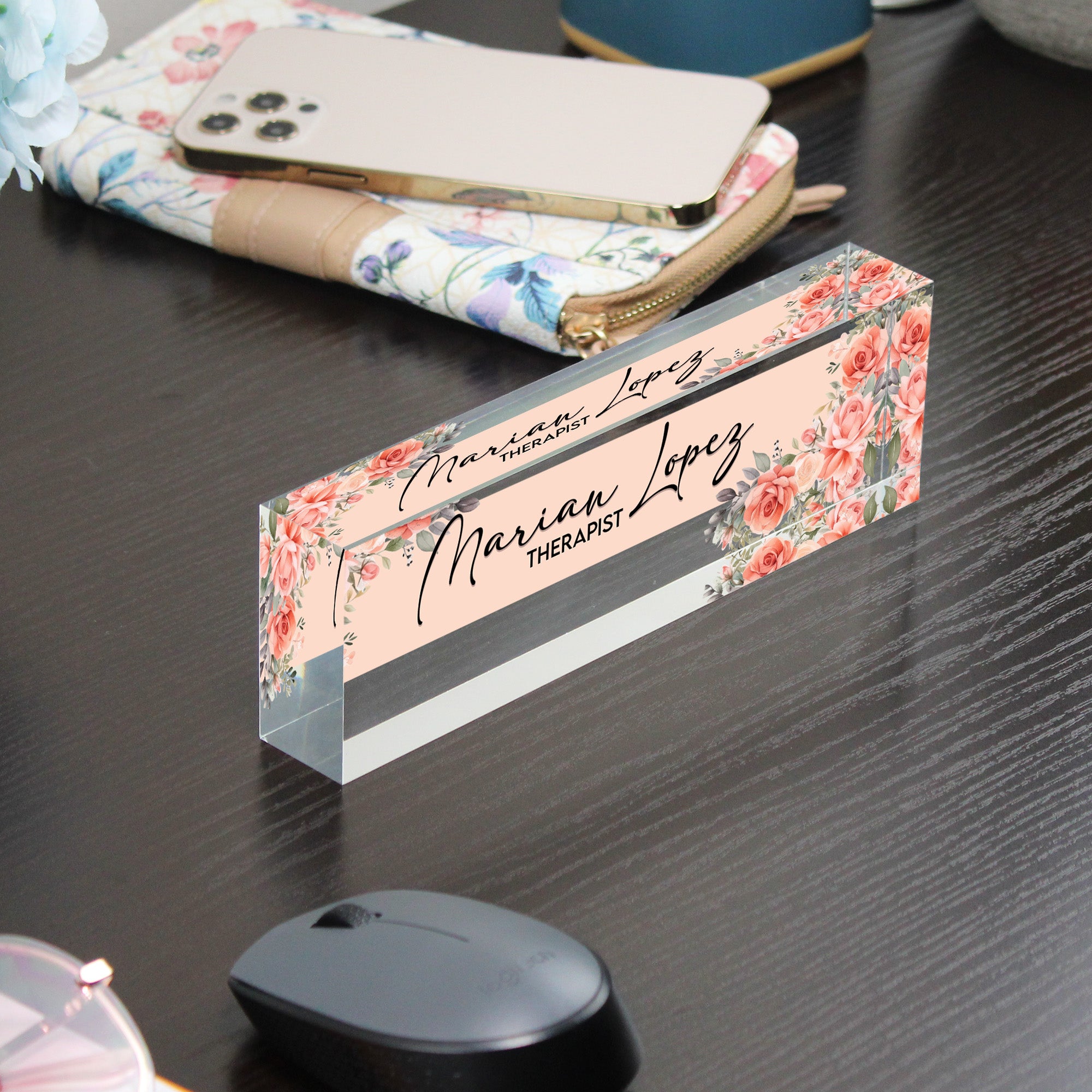 TAGS: personalized desk plaque, acrylic name plate, floral office decor, custom therapist gift, handmade desk block, personalized office gift, floral desk accessory, professional name plate, custom office decor, therapist decor, unique gifts for professionals, corporate gift ideas, elegant workspace decor, personalized gifts for women, office gifts for her