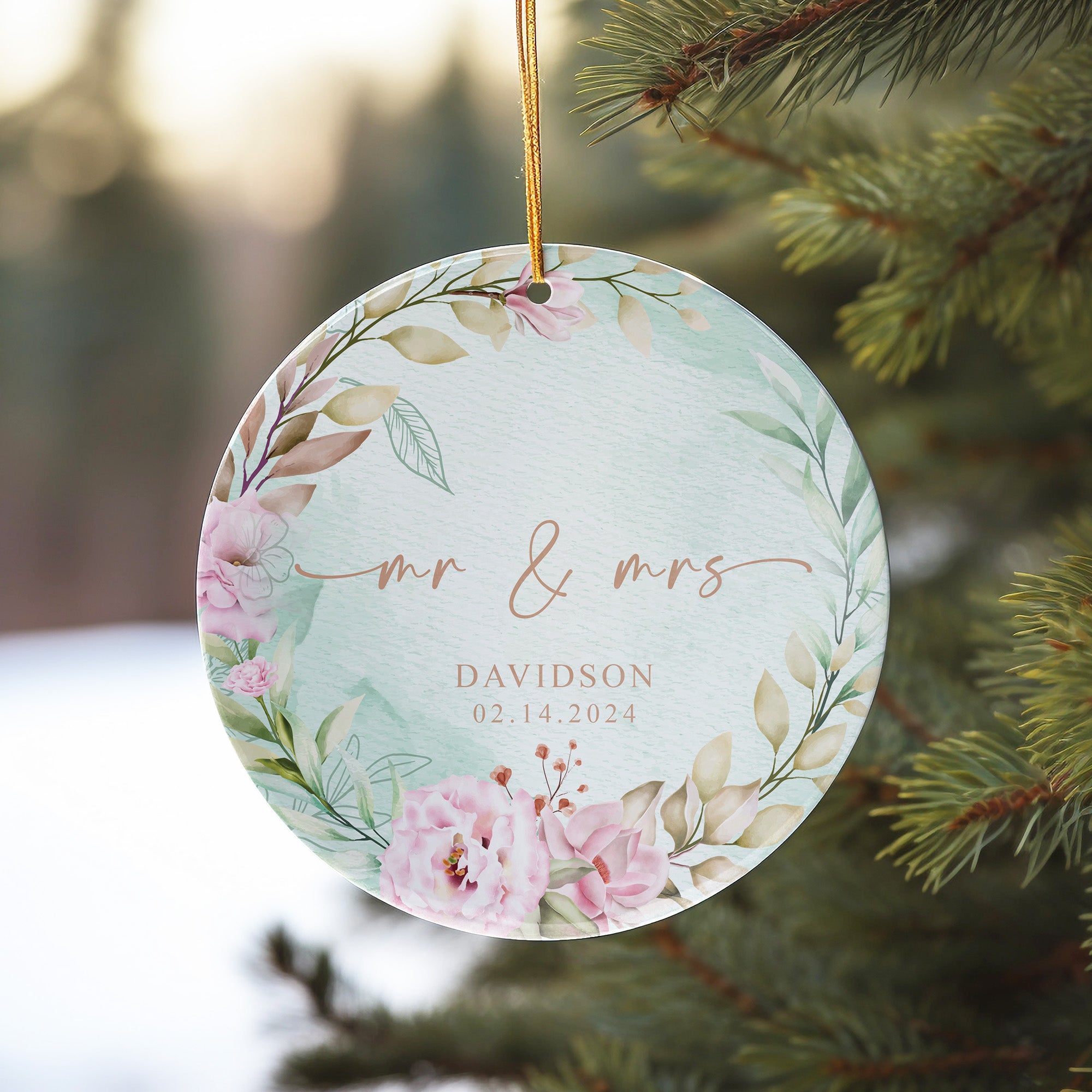 TAGS: personalized ornament, ceramic ornament, wedding gift, newlyweds, Valentine's Day, floral design, custom keepsake, anniversary gift, handmade ornament, home decor, romantic gift, elegant ornament, gift for couple, Mr and Mrs, special date