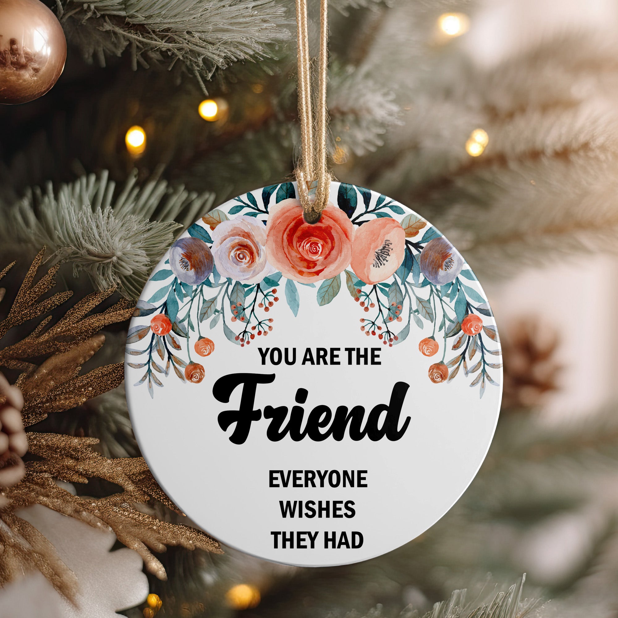 Celebrate the beauty of friendship with our stunning Personalized Floral Friendship Ceramic Ornament. Crafted with precision and care, this ornament features a vibrant floral design that exudes warmth and charm. Delicate watercolor flowers frame the heartfelt message: "You Are the Friend Everyone Wishes They Had," making it a perfect token of appreciation for that special friend in your life.